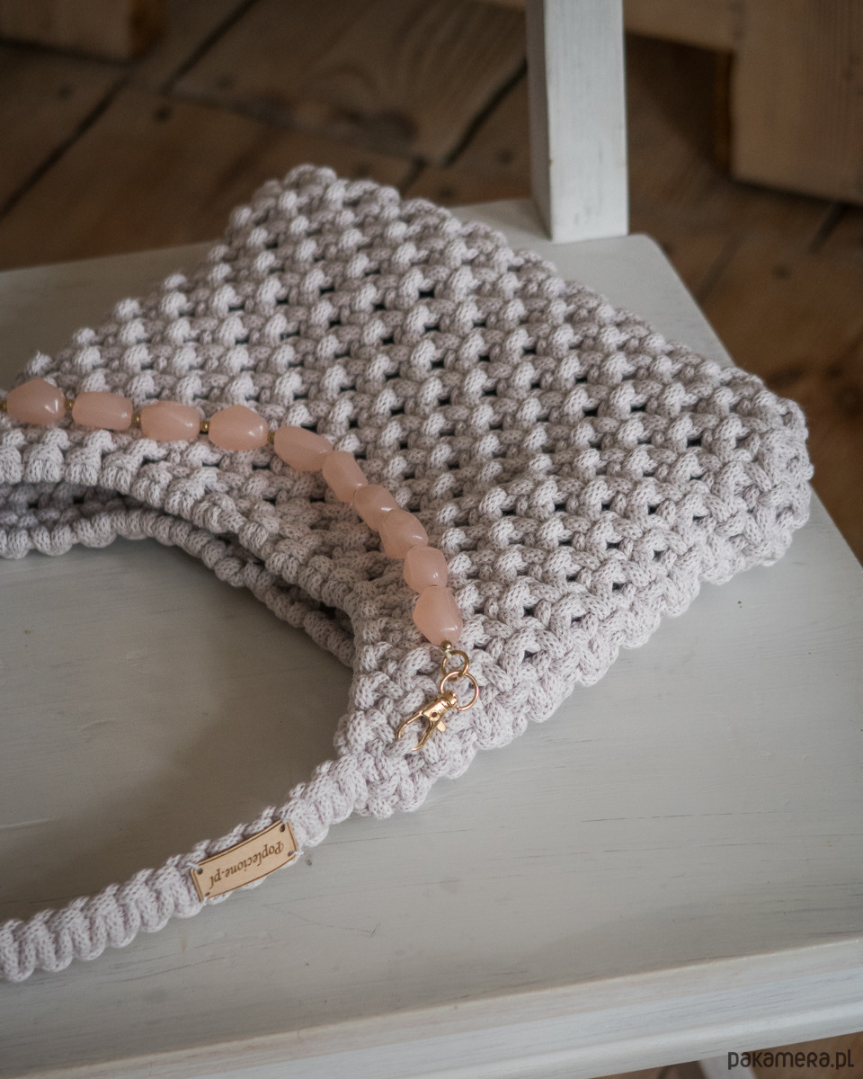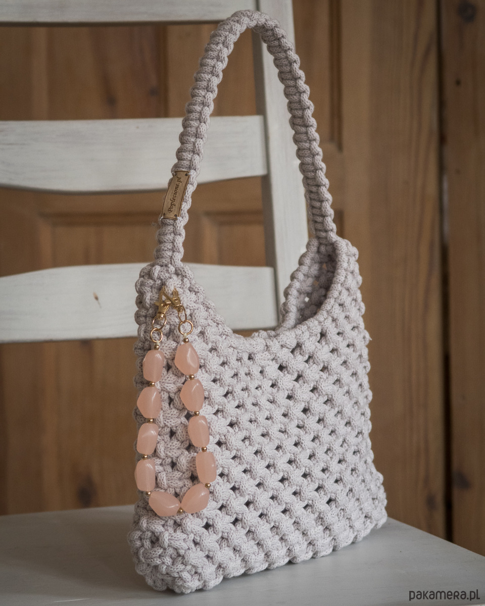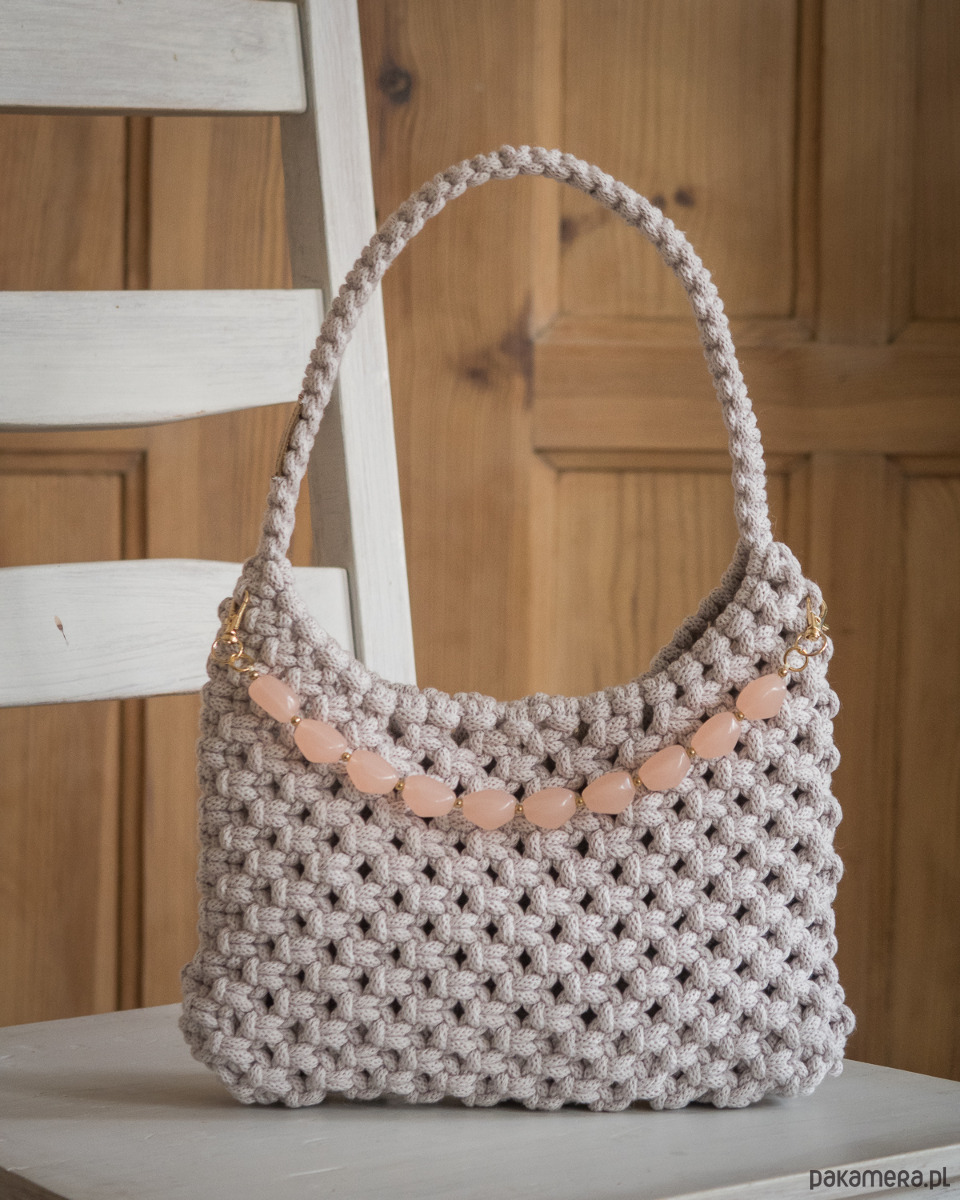 Ta torebka w stylu boho zachwyca grubym, dekoracyjnym makramowym splotem oraz dodatkiem dekoracyjnego łańcuszka, który dodaje jej charakteru.