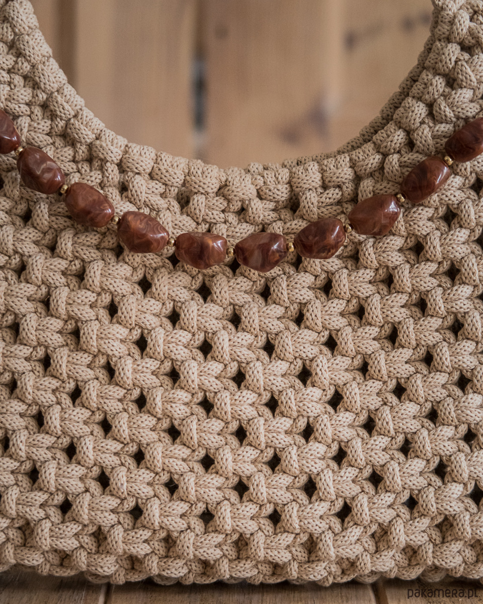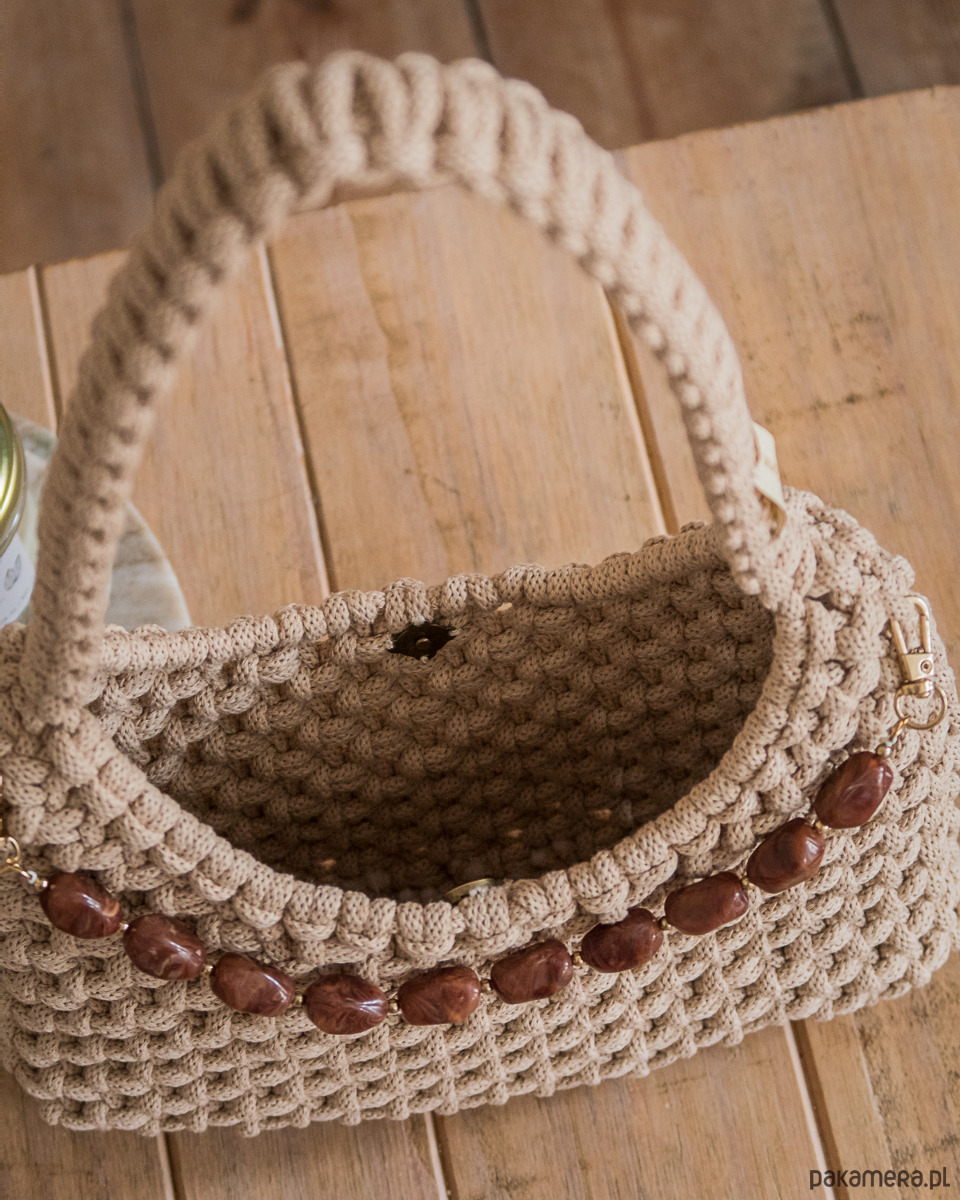 Ta torebka w stylu boho zachwyca grubym, dekoracyjnym makramowym splotem oraz dodatkiem dekoracyjnego łańcuszka, który dodaje jej charakteru.