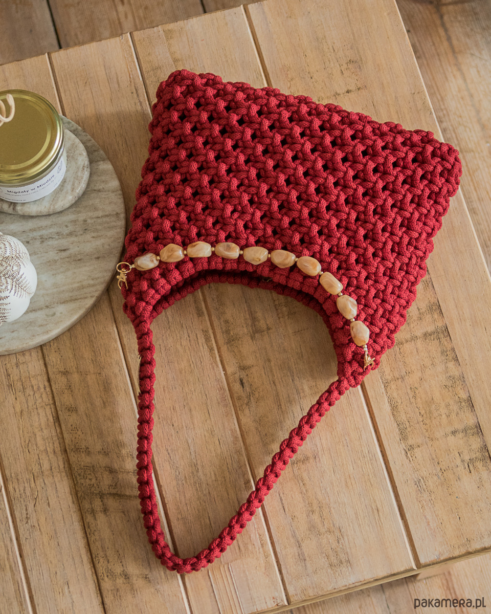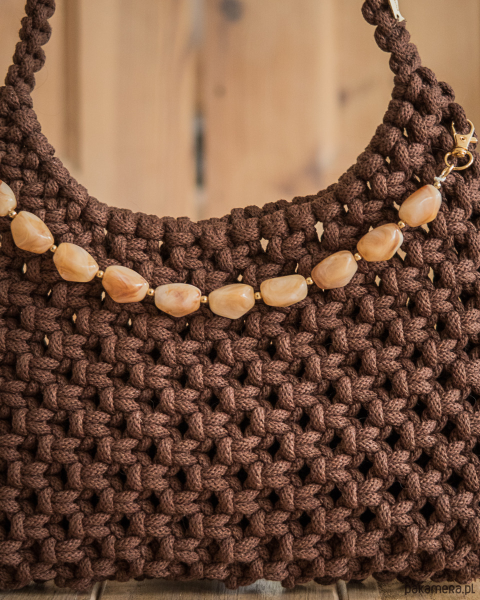 Ta torebka w stylu boho zachwyca grubym, dekoracyjnym makramowym splotem oraz dodatkiem dekoracyjnego łańcuszka, który dodaje jej charakteru.