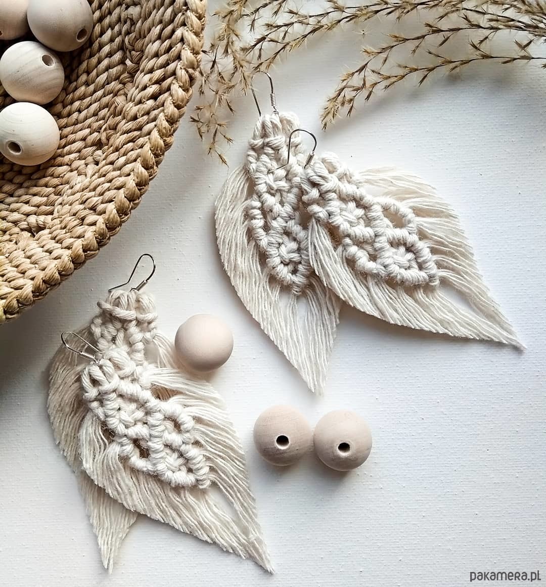 Kolczyki wykonane techniką makrama w kolorze złamanej bieli.