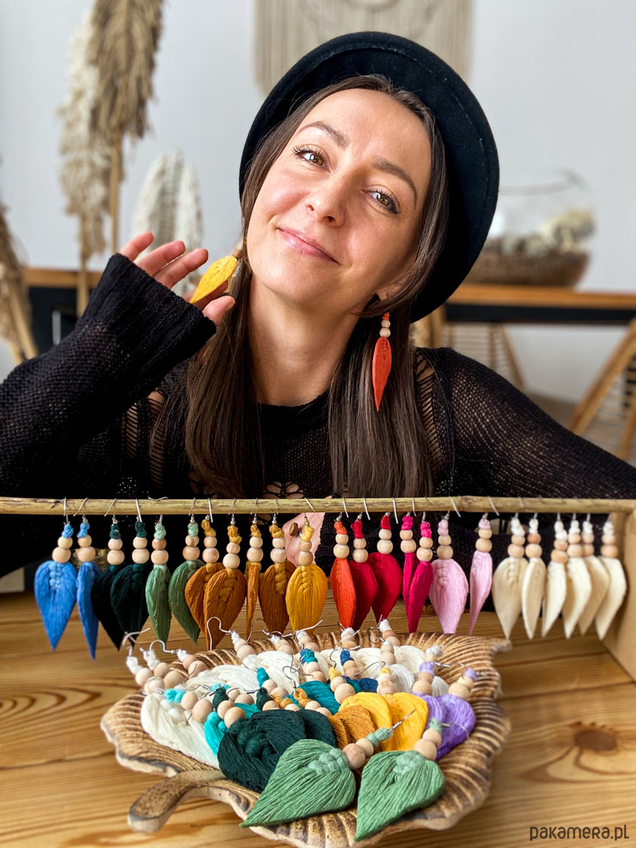 Kolczyki są usztywnione i wystabilizowane moją autorską metodą, dzięki czemu utrzymują swój kształt i jednocześnie zachowują strukturę sznurka bawełnianego.