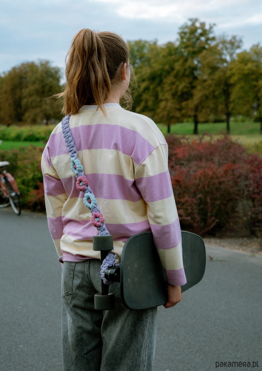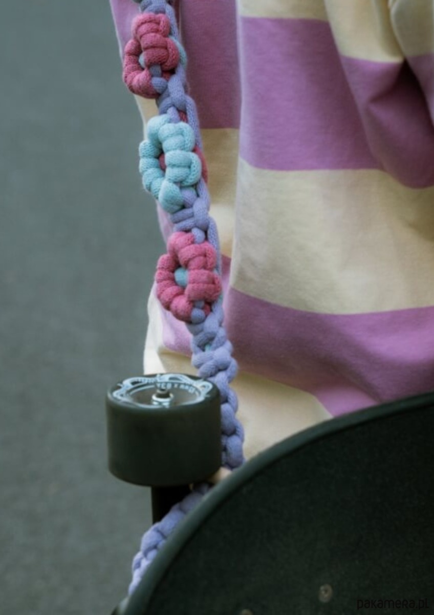 Makramowy pasek zaprojektowany specjalnie dla deskorolkarzy i wszystkich, którzy lubią wyróżniać się detalem. Ręcznie pleciony ze sznurka, ozdobiony kwiatowym wzorem w maksymalnie trzech kolorach – jeden stanowi bazę paska, a dwa kolejne tworzą barwne akcenty kwiatów. Dzięki solidnemu splotowi pasek jest wytrzymały i wygodny w użytkowaniu, a jednocześnie pełni funkcję ozdobną. To dodatek, który łączy praktyczność z niepowtarzalnym stylem - Twoja deska zyska nową, kolorową historię.