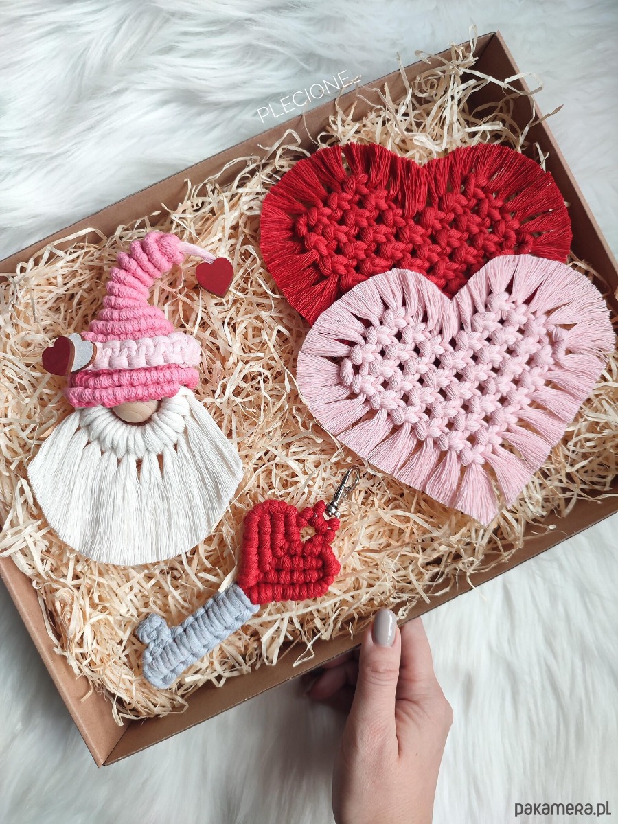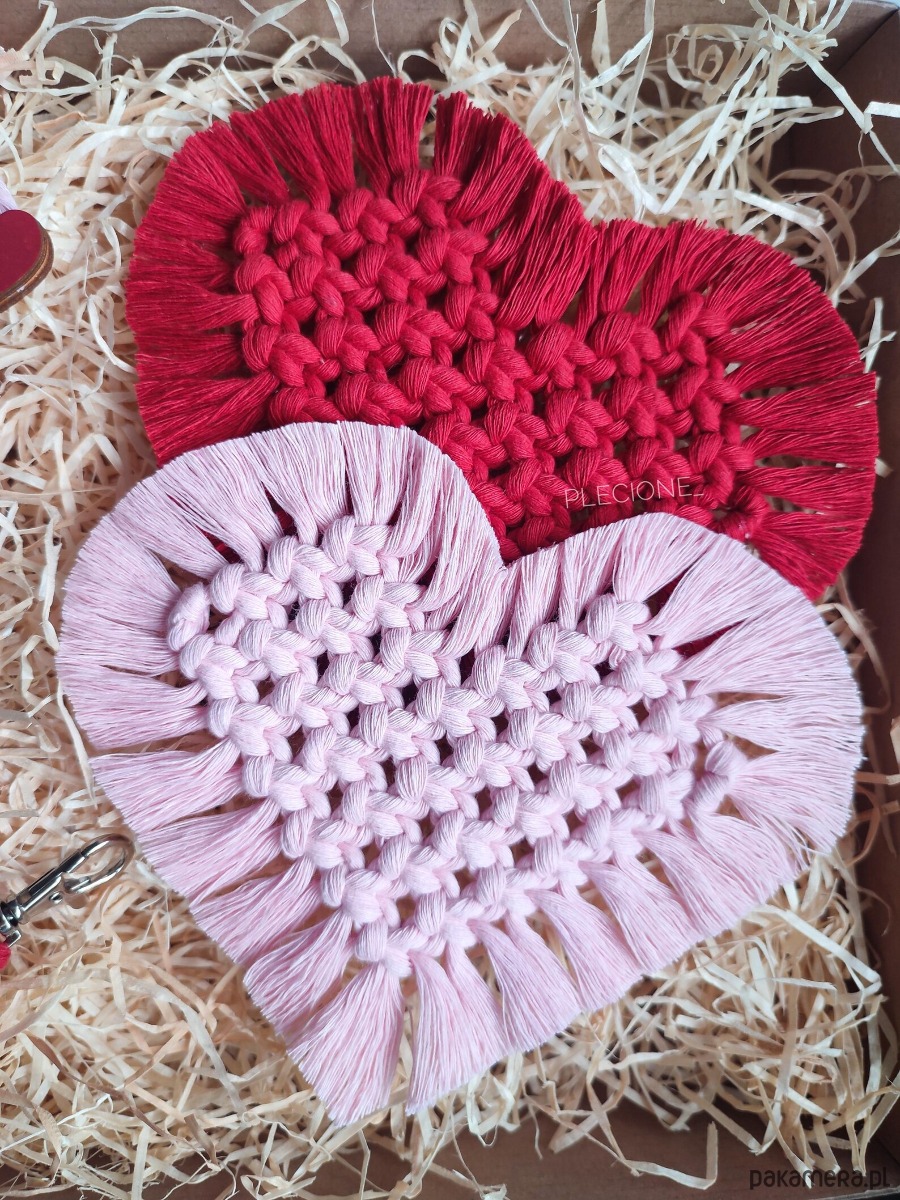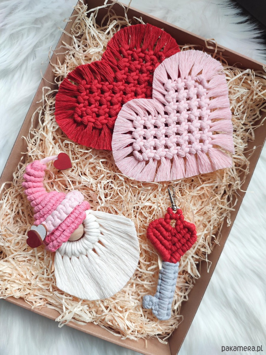 Zestaw ręcznie robionych dodatków z makramy, wykonanych z wysokiej jakości, 100% bawełnianego sznurka. Delikatne odcienie różu i klasyczna czerwień tworzą ciepłą, przytulną całość — idealną na prezent, dekorację wnętrza lub jako drobny upominek z sercem.