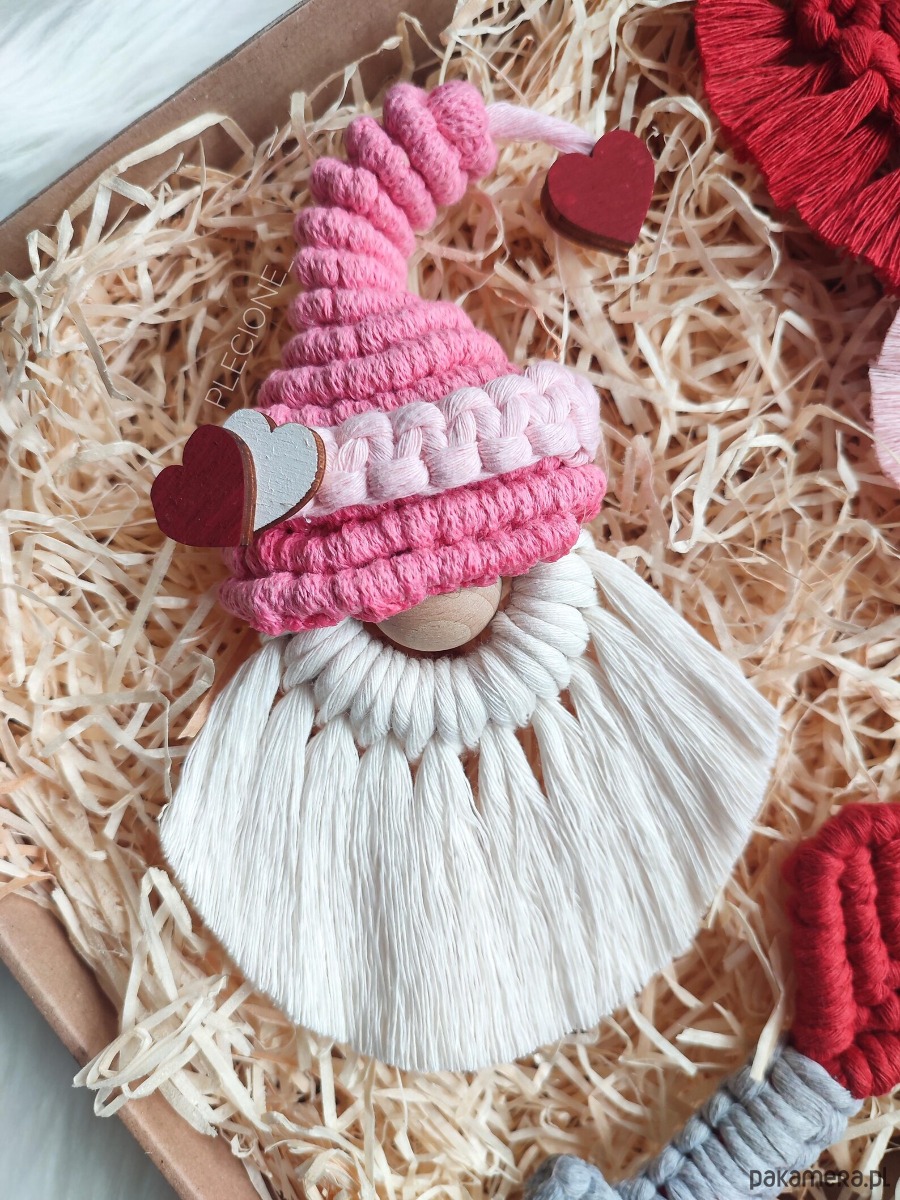 Makramowego Mikołaja w różowo-białej kolorystyce