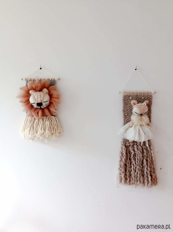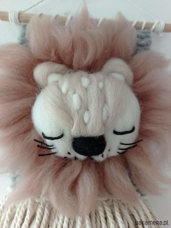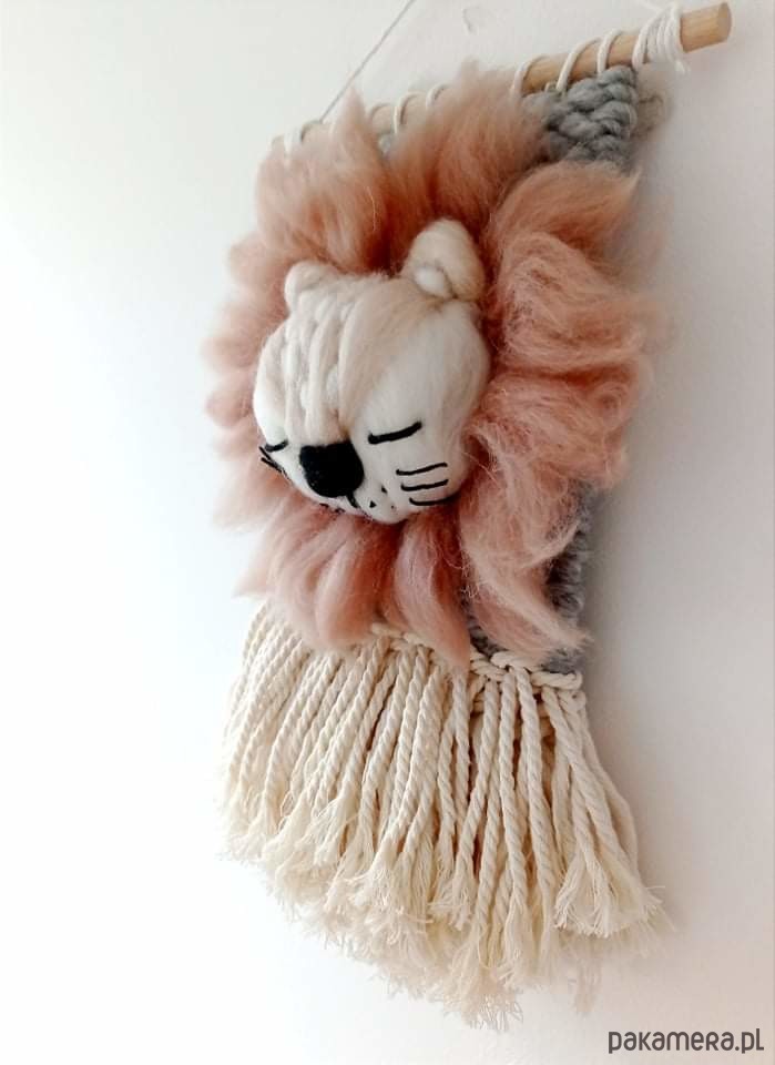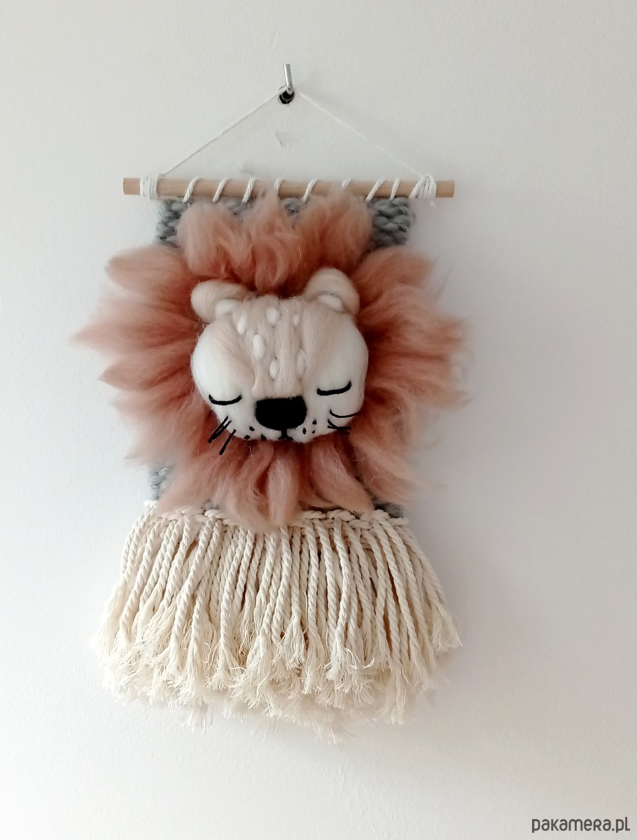 Makatka z lwem utkana na krośnie z różnych rodzajów włóczki.