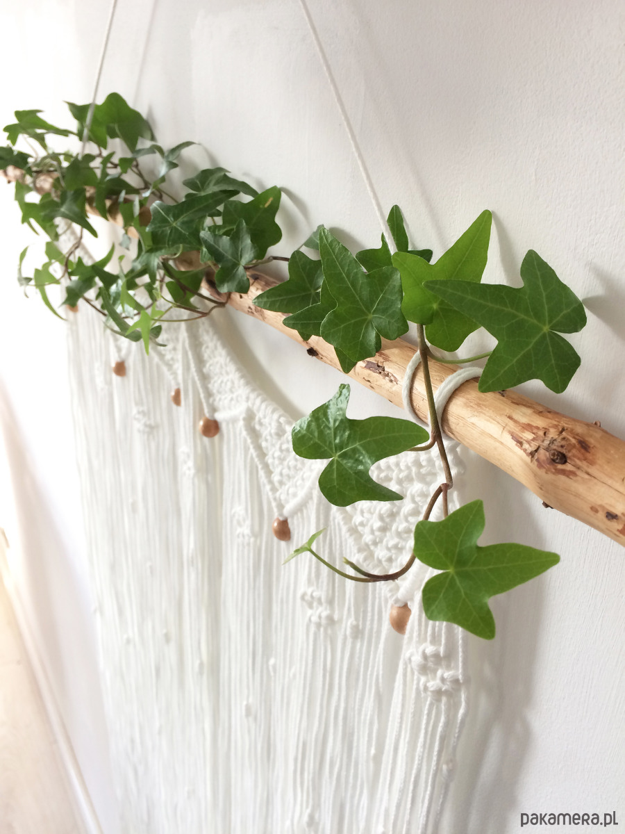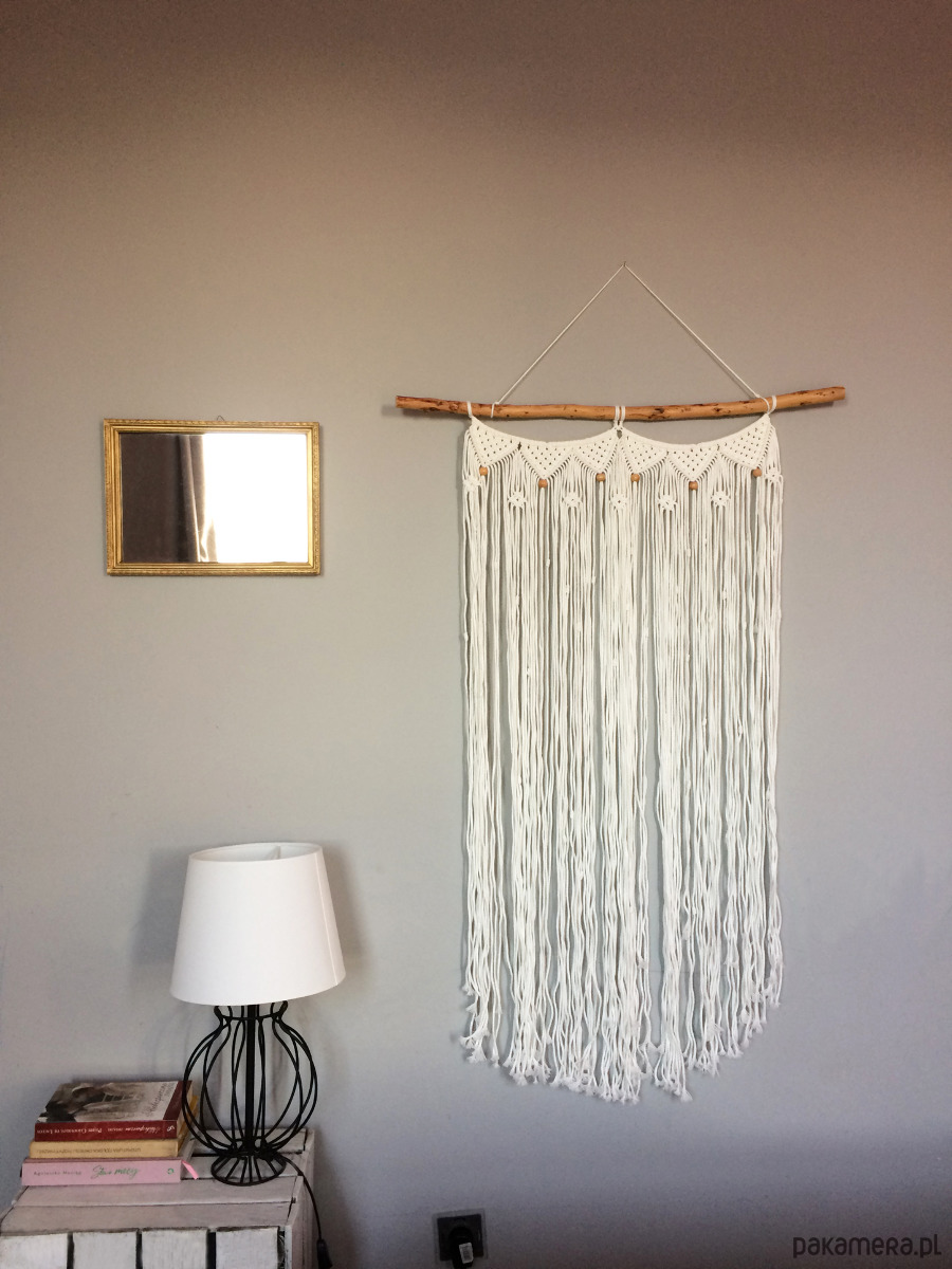 Dekoracja ścienna wykonana techniką makramy.