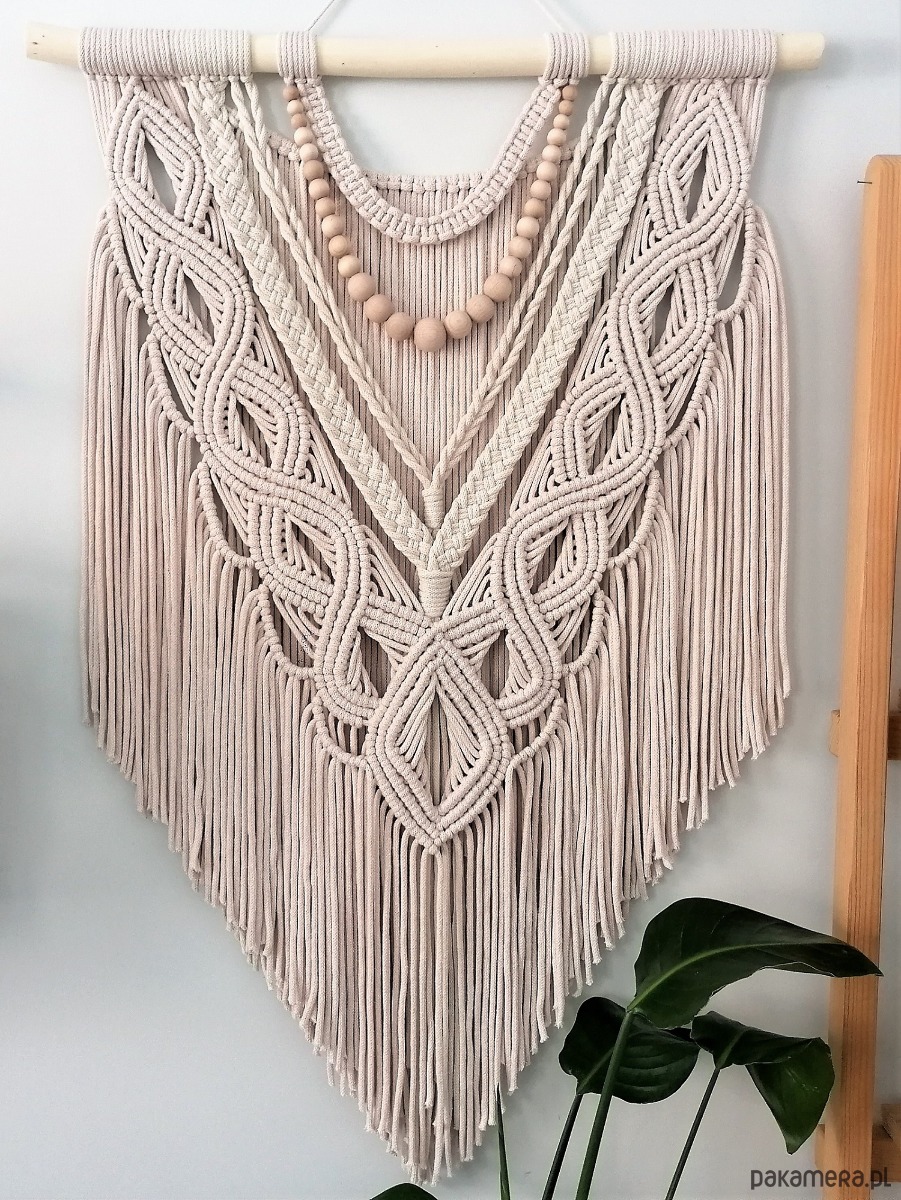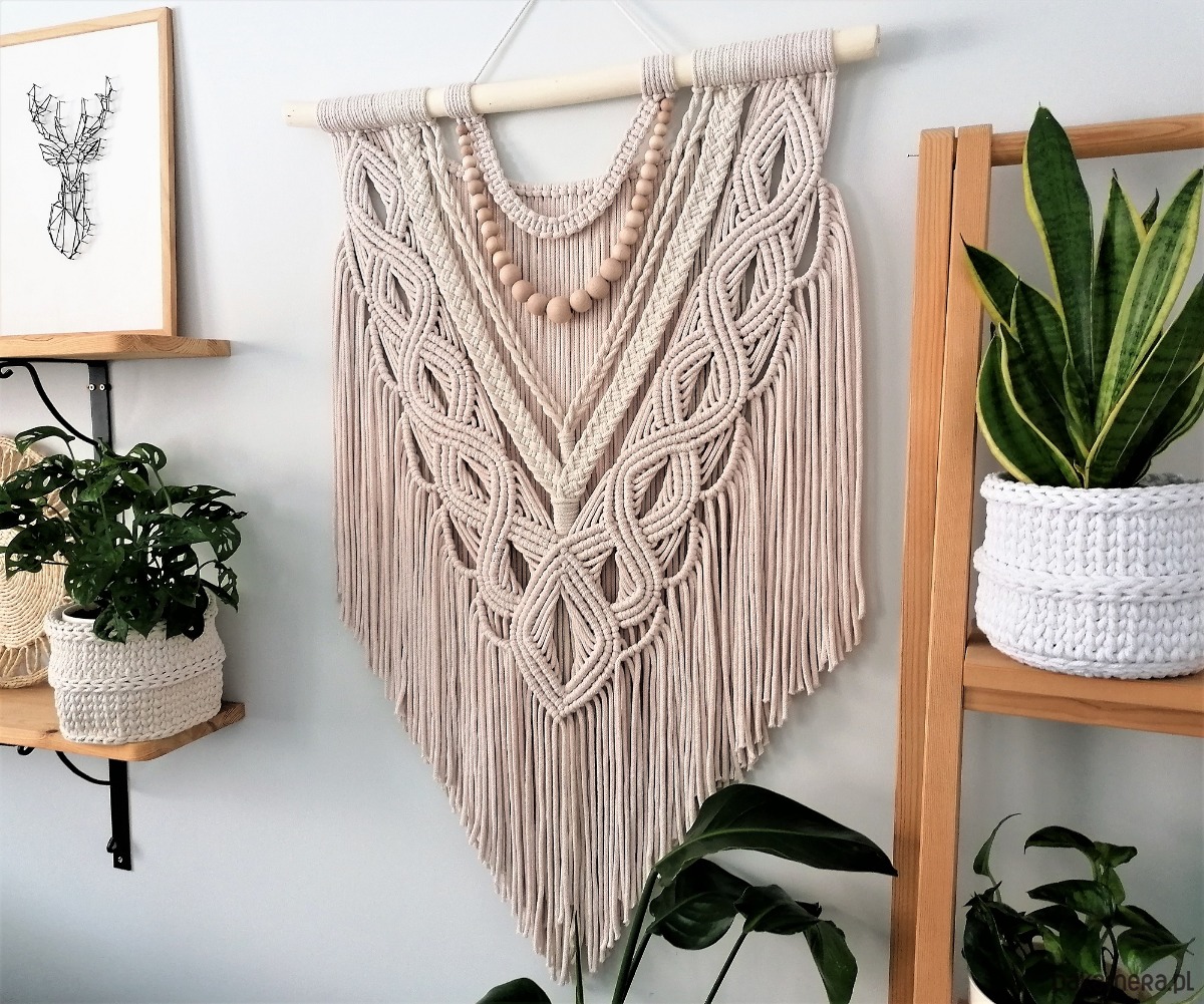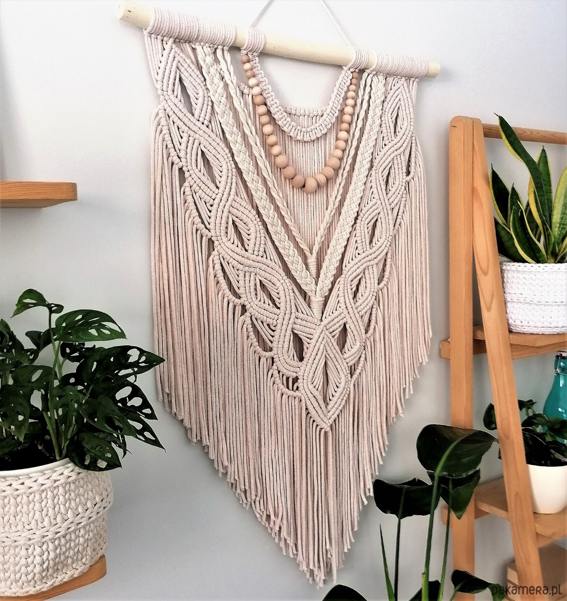 Makrama ścienna wykonana ze sznurka bawełnianego 5 mm w dwóch odcieniach koloru ecru z dodatkiem korali z naturalnego drewna. Idealny dodatek do wnętrz w stylu boho, skandynawskim, hampton, shabby chic, a nawet do aranżacji eklektycznych.