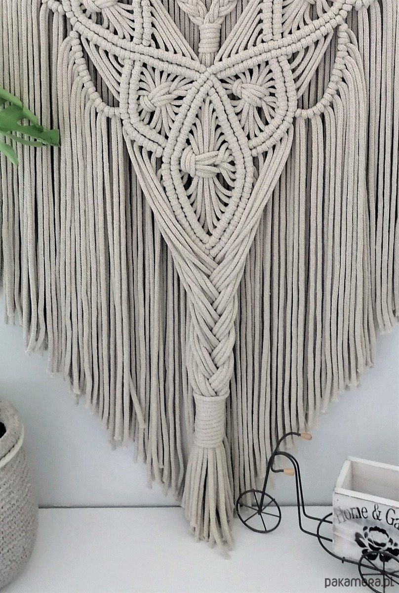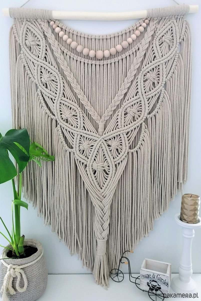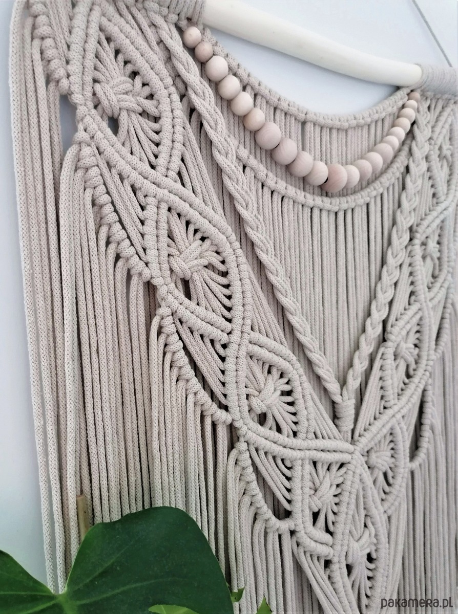 Makrama ścienna wykonana ze sznurka bawełnianego 5 mm w kolorze naturalnym z dodatkiem korali z naturalnego drewna. Idealny dodatek do wnętrz w stylu boho, skandynawskim, hampton, shabby chic, a nawet do aranżacji eklektycznych.