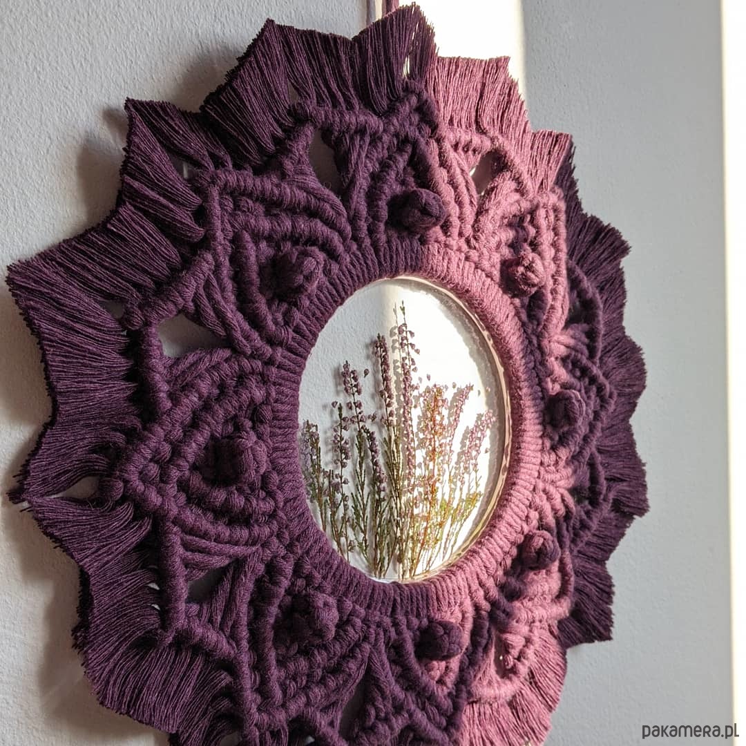 Witraż w postaci wrzosu zatopionego w żywicy epoksydowej został umieszczony w makramowej ramie.
