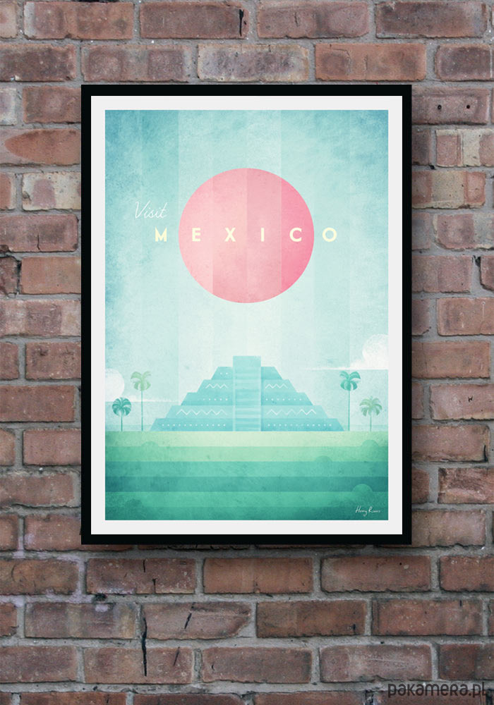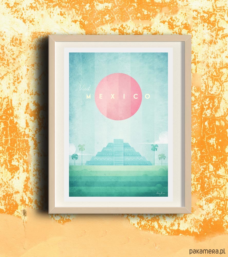Plakat w stylu vintage przedstawiający zachód słońca nad piramidą Kukulkana, zbudowaną przez Majów w mieście Chichen Itza (teren obecnego Meksyku). Inspirowany plakatami podróżniczymi z lat 20-tych XX wieku.