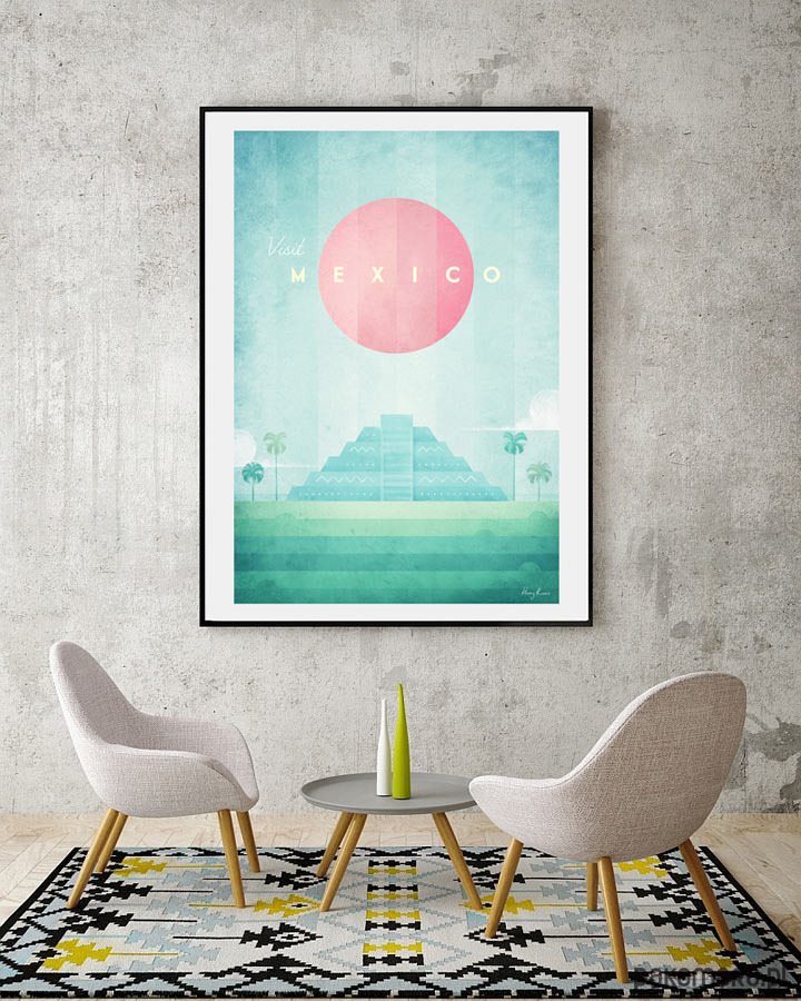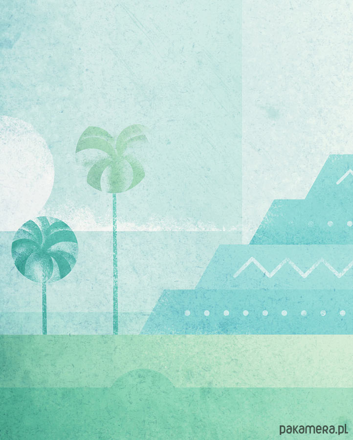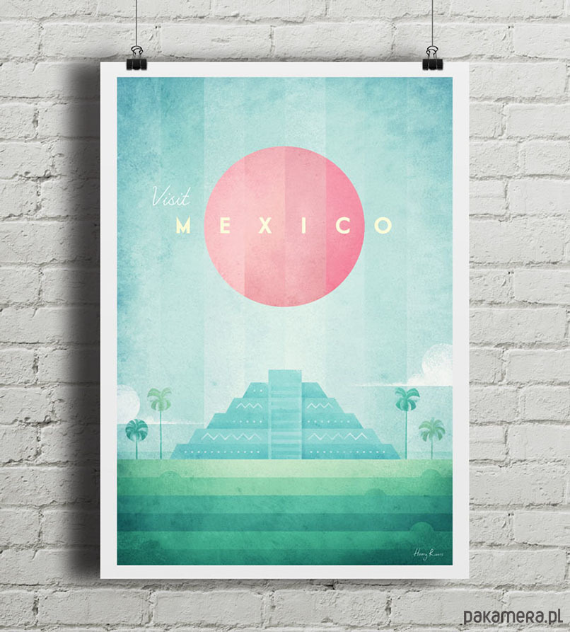 Plakat w stylu vintage przedstawiający zachód słońca nad piramidą Kukulkana, zbudowaną przez Majów w mieście Chichen Itza (teren obecnego Meksyku). Inspirowany plakatami podróżniczymi z lat 20-tych XX wieku.