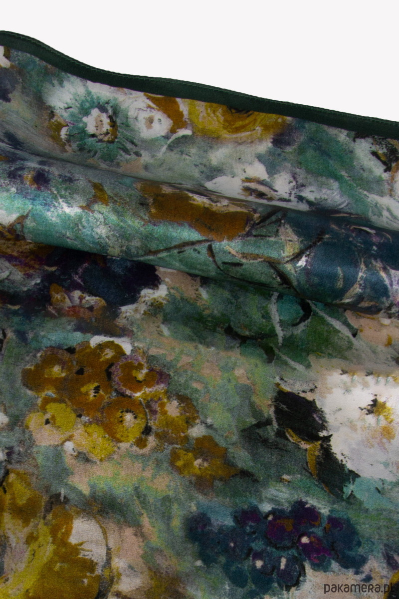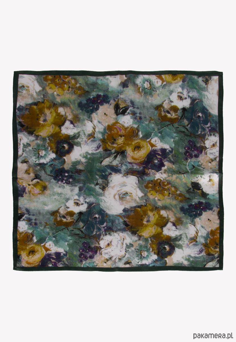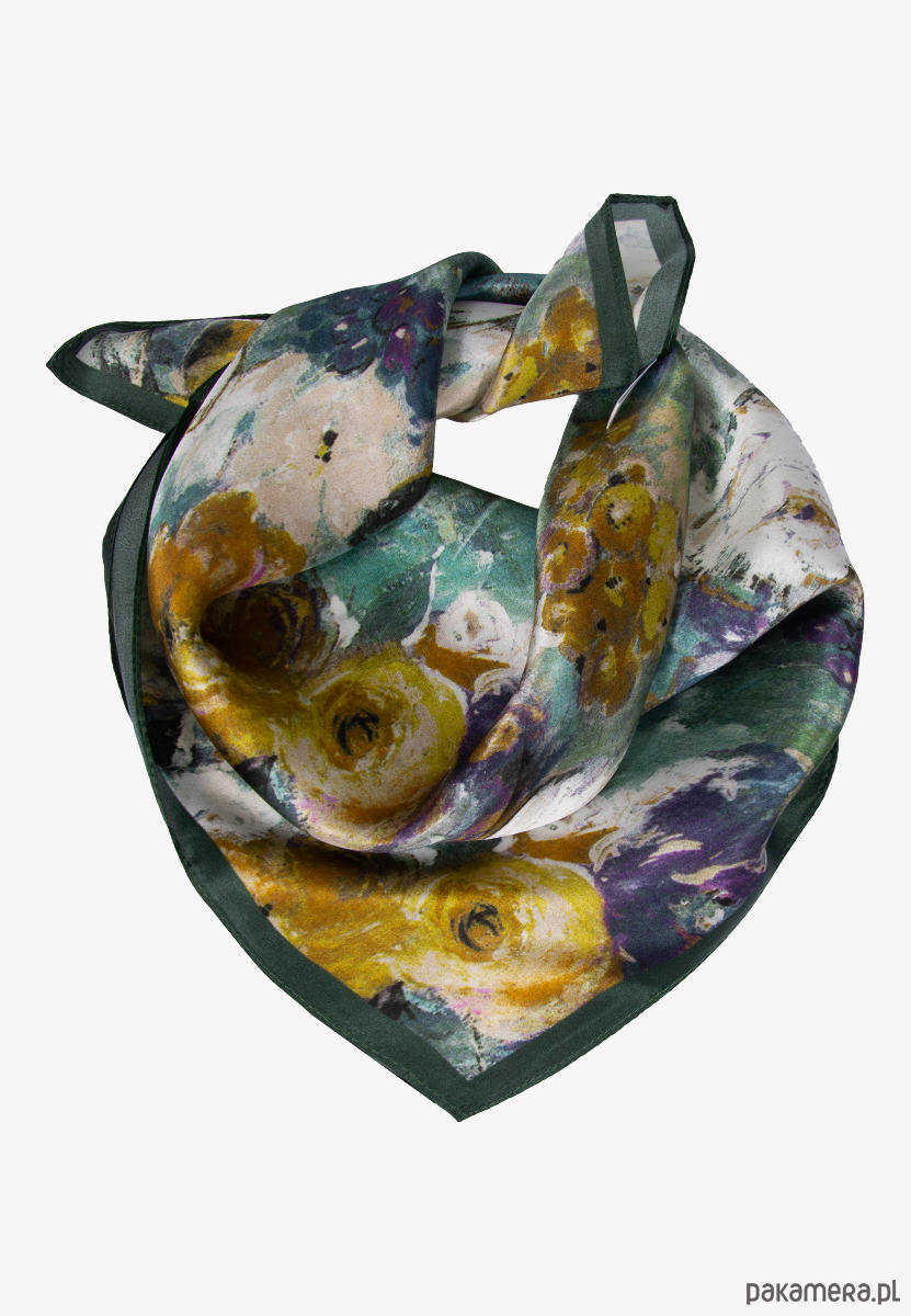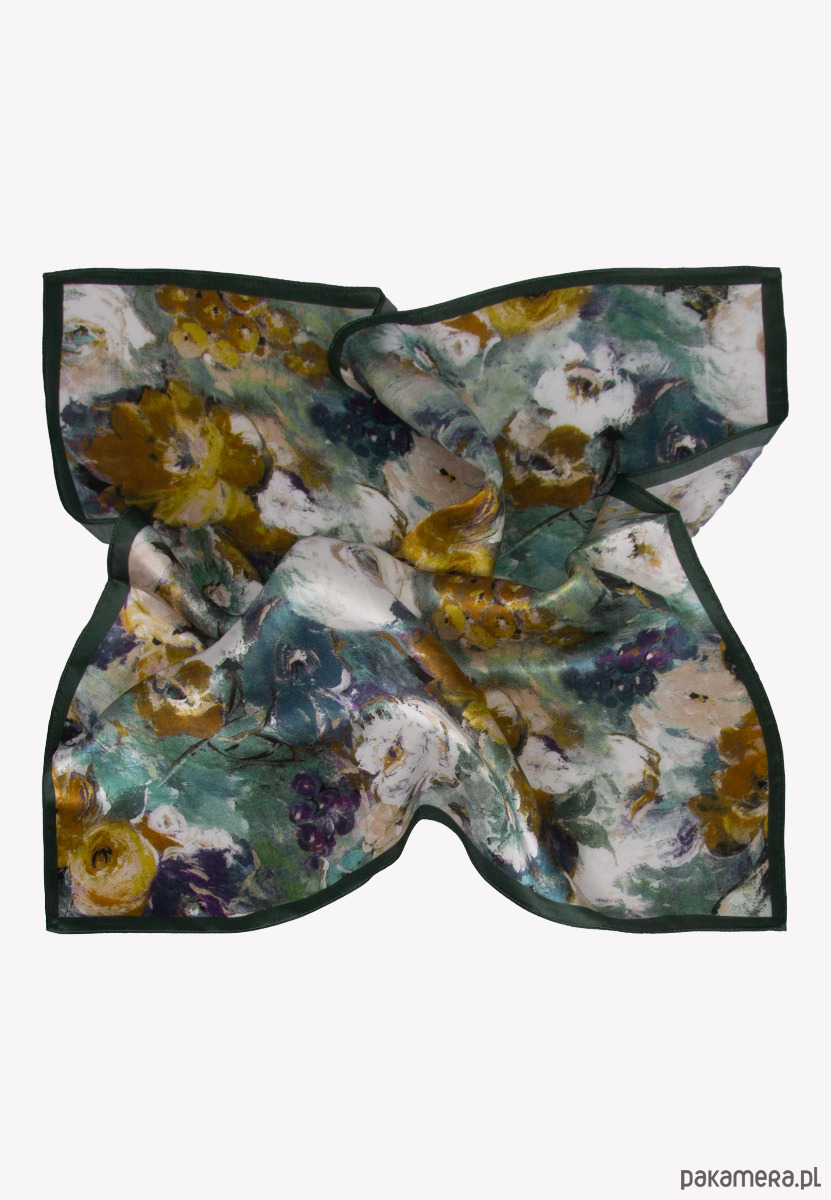 Elegancka gawroszka o malarskim, kwiatowym wzorze w odcieniach złota, zieleni i fioletu. Wykonana z delikatnego, lekko połyskującego materiału, obszyta ciemnozieloną lamówką. Tło kompozycji utrzymane jest w rozmytych, malarskich tonach, co nadaje jej artystycznego i nieco nostalgicznego charakteru. Stylowy i wszechstronny dodatek do każdej stylizacji.