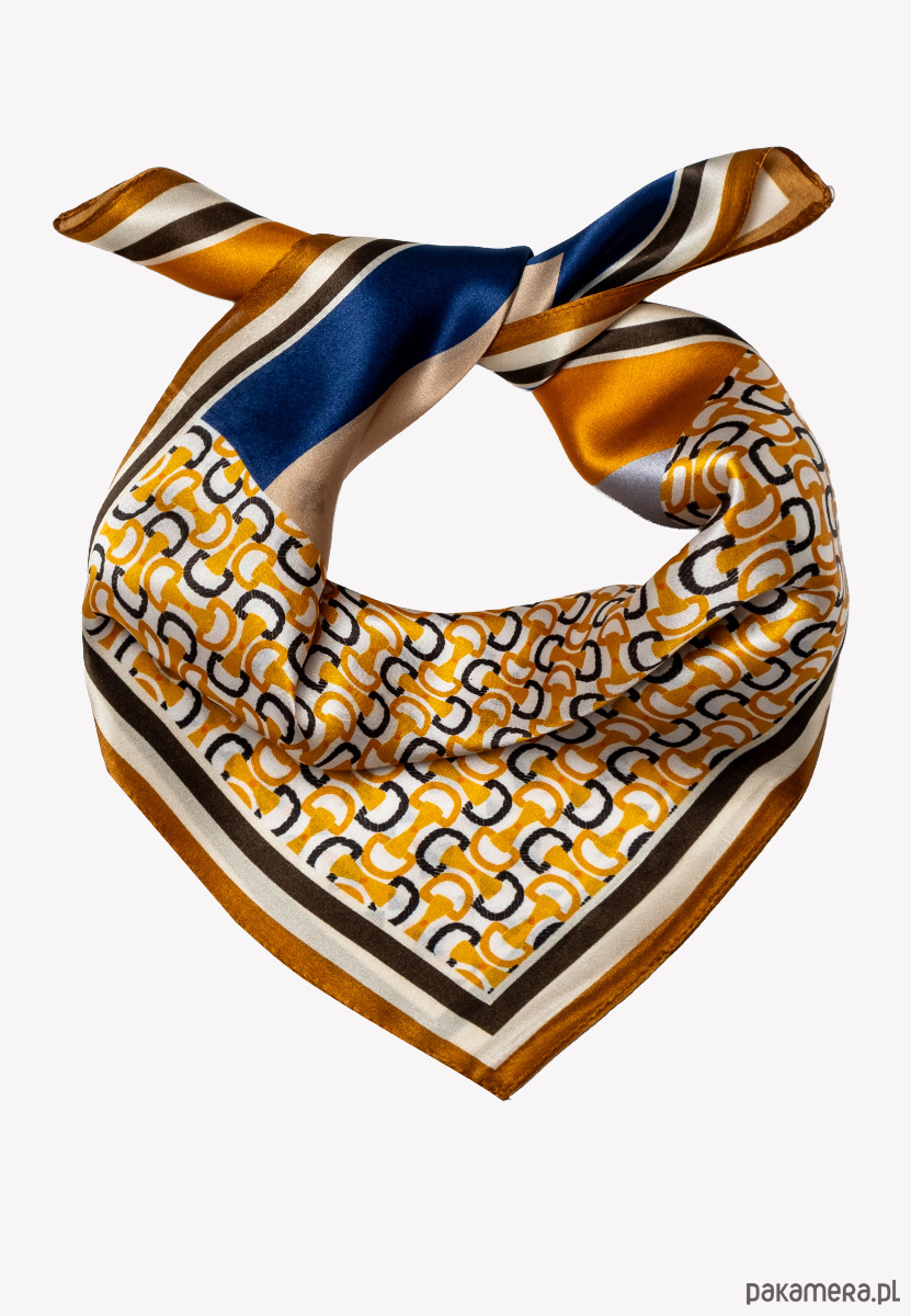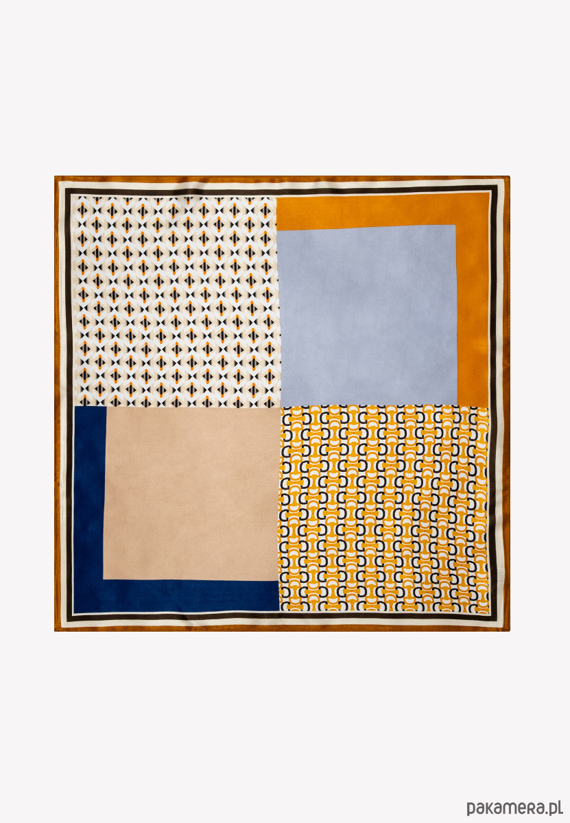Mała jedwabna apaszka zachwyca geometrycznym wzorem w stylu retro, łączącym odcienie musztardowej żółci, granatu, beżu i błękitu. Wykonana z delikatnego, gładkiego jedwabiu, jest lekka, przyjemna w dotyku i pięknie układa się przy każdym wiązaniu. Jej kompaktowy rozmiar pozwala nosić ją na wiele sposobów – na szyi, nadgarstku, wpiętą we włosy czy jako ozdobę torebki. To elegancki dodatek, który doda stylu zarówno codziennym, jak i wieczorowym stylizacjom.