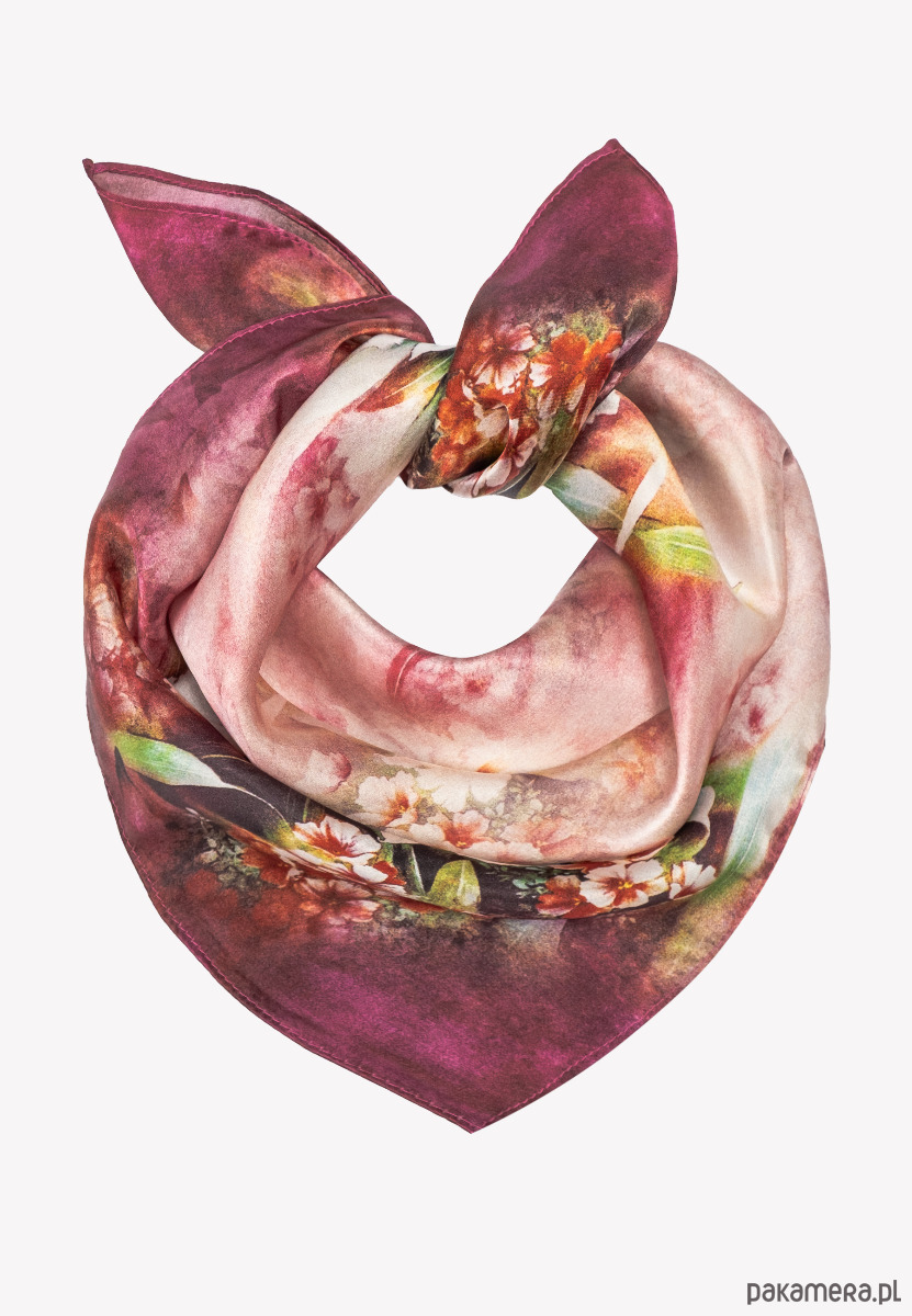 Zmysłowa, kobieca i pełna głębi — apaszka  przyciąga wzrok niczym obraz w ruchu. Połączenie różu, bordo i kremu tworzy miękkie przejścia kolorystyczne, które przenoszą w romantyczny świat kwitnących ogrodów. Delikatny jedwab pięknie układa się na szyi, a jego subtelny połysk dodaje klasy i elegancji.
