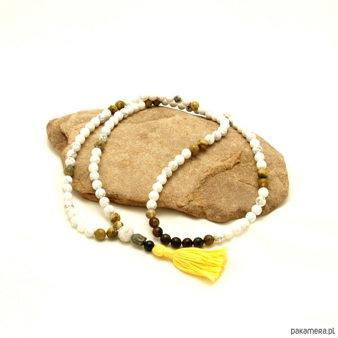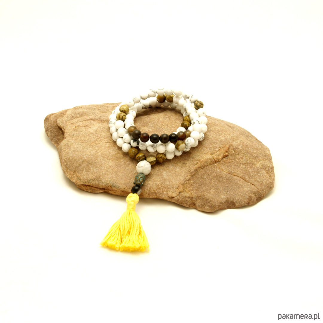 skład: howlit i jaspis obrazkowy, stupa: howlit biały (kula 14mm), Budda: hematyt