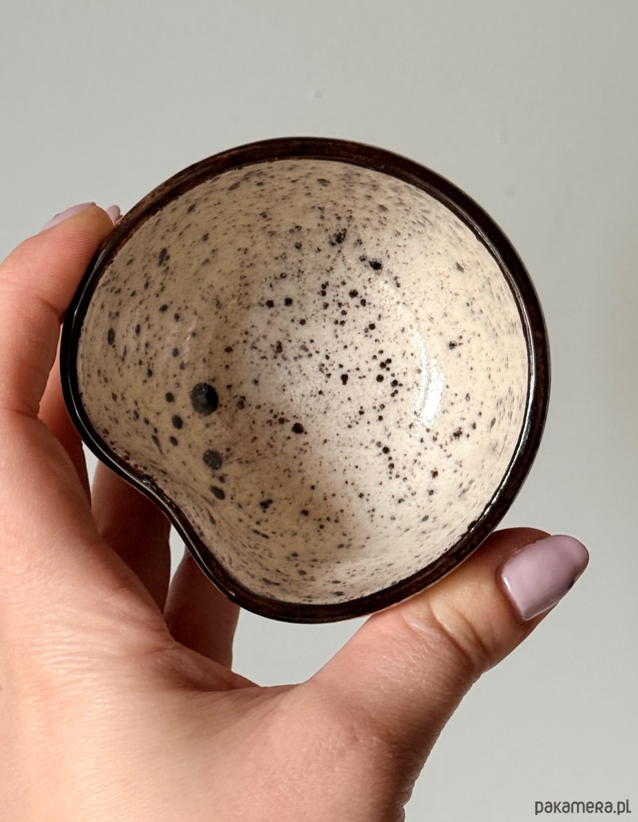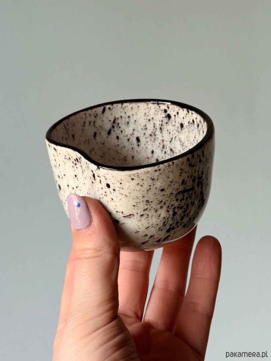 Ręcznie wykonana czarka, stworzona na kole garncarskim z białej gliny w brązowe ciapki.