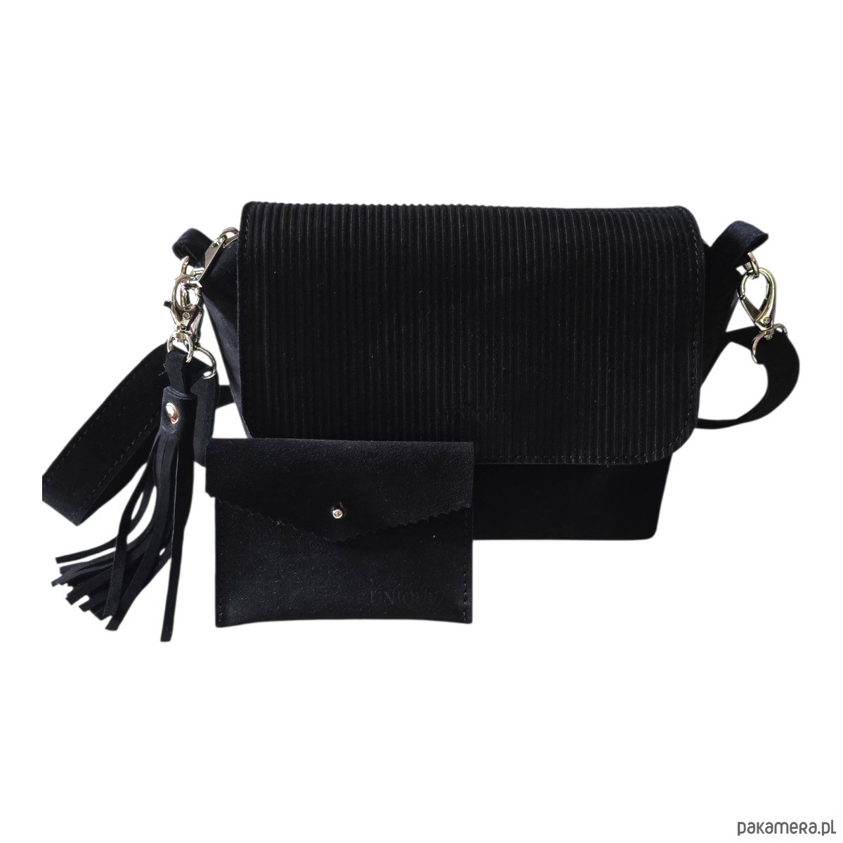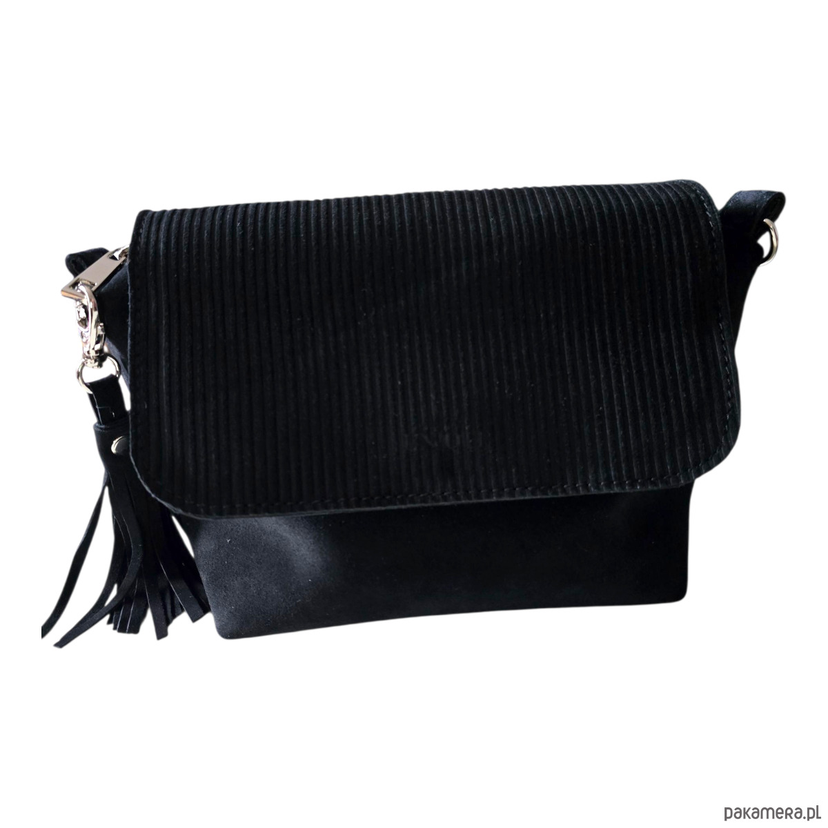 Uszyta z naturalnej skóry zamszowej, klapka tłoczona w prążki tzw. 'sztruks'.
