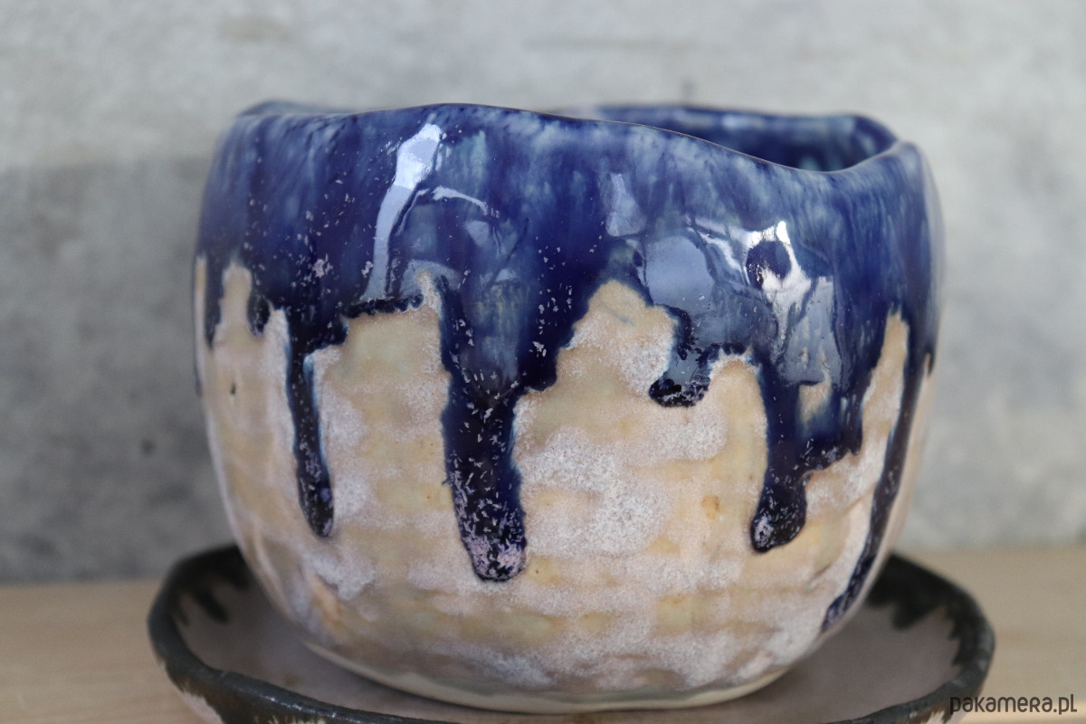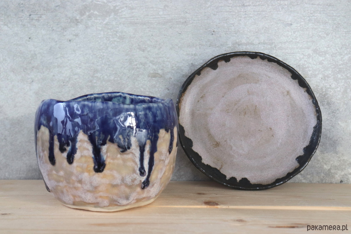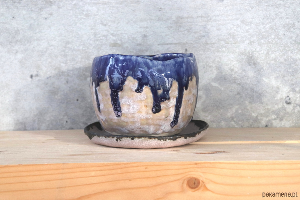Masywna doniczka wykonana z jasnej gliny, dekorowana szaro-różowym oraz kobaltowym szkliwem. Podstawka szkliwiona szaro-różowym szkliwem wewnątrz z ciemną obwódką na brzegu. Naczynie zostało wykonane ręcznie, bez użycia koła garncarskiego.
