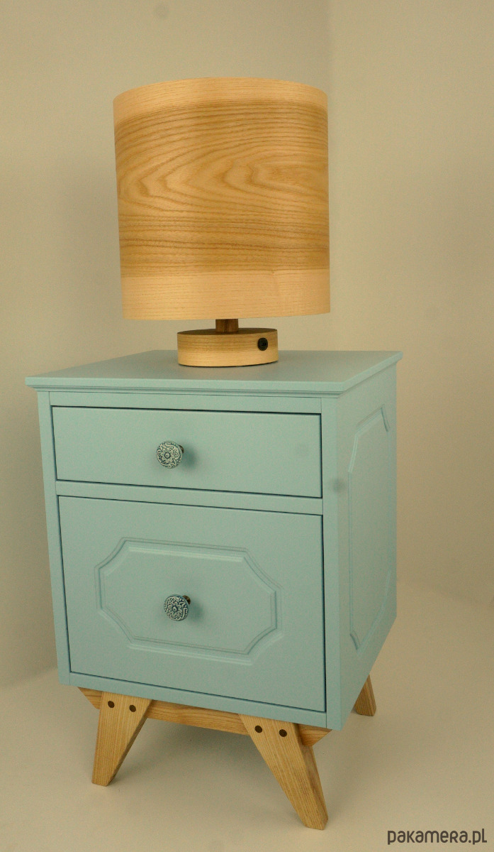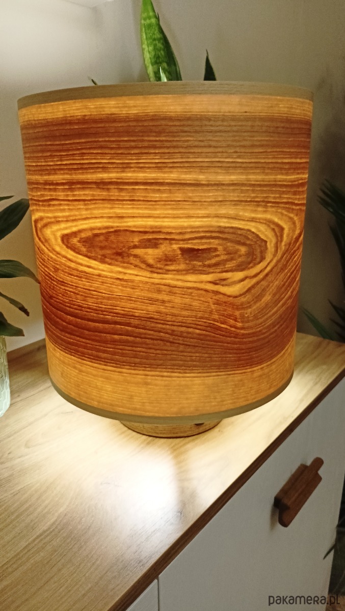 Mała lampa drewniana, stołowa, fornir, włącznik zbliżeniowy