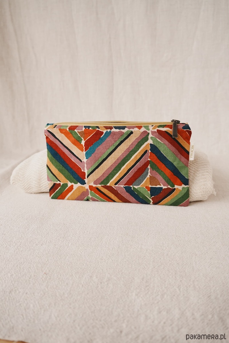 Kosmetyczka powstała częściowo z tkanin z drugiego obiegu oraz tkanin deadstockowych - kolekcja upcycling