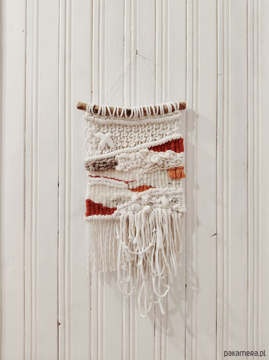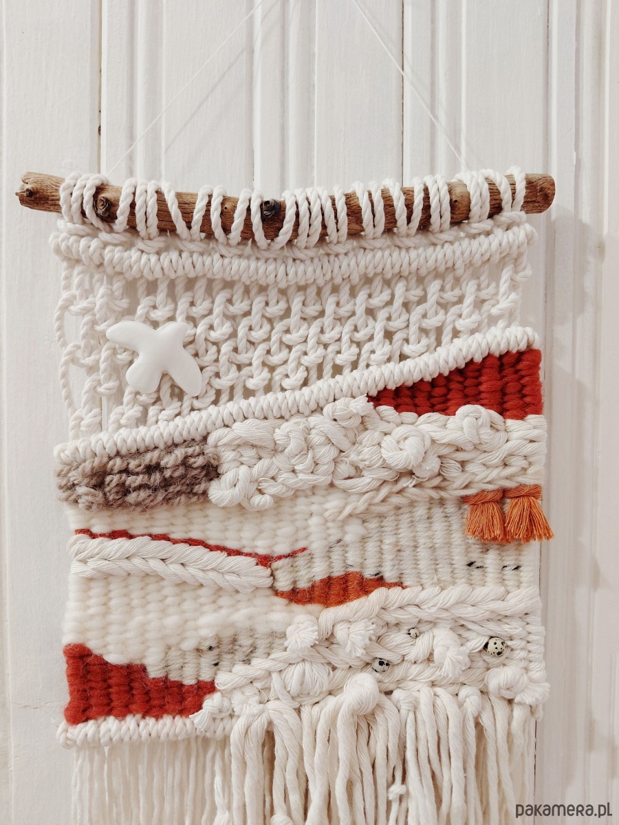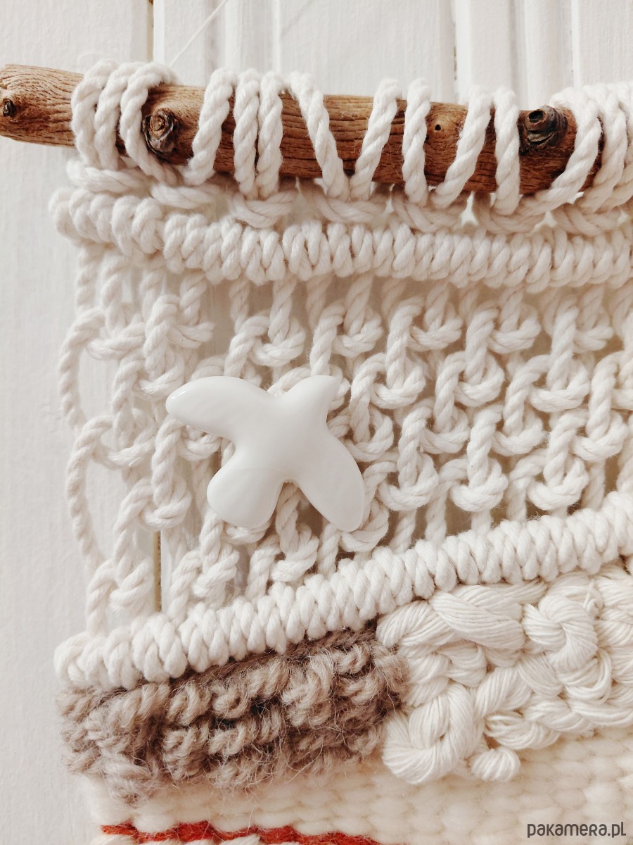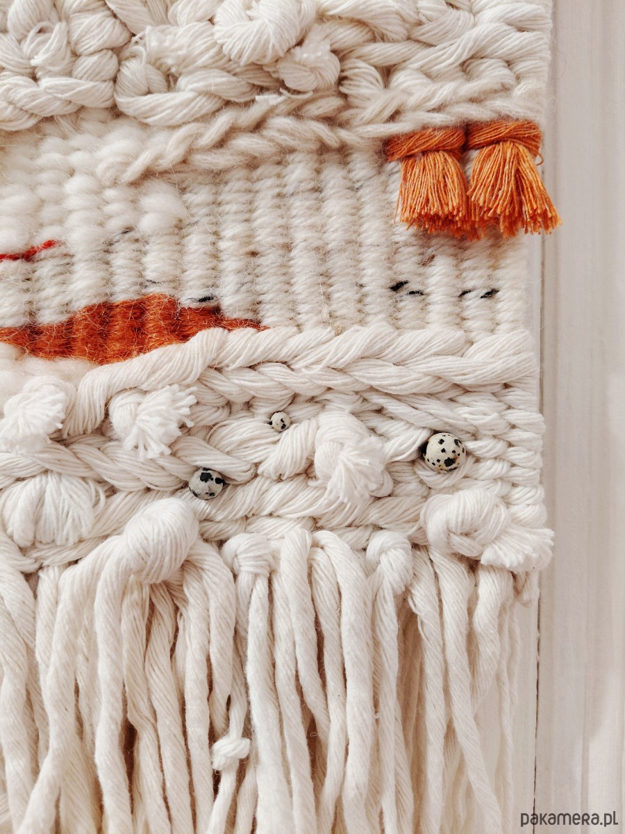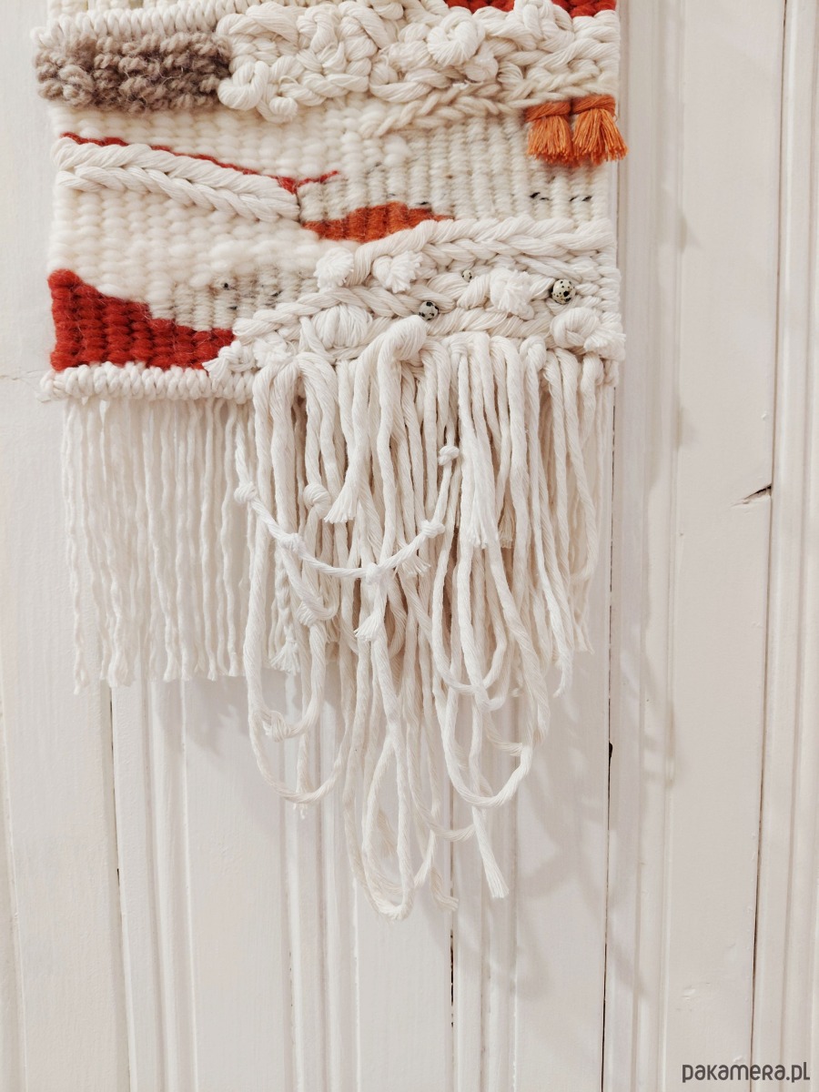 Unikalna dekoracja ścienna z makramy wykończona wełną owczą i alpaki. Wykonana ręcznie przy użyciu naturalnych materiałów.