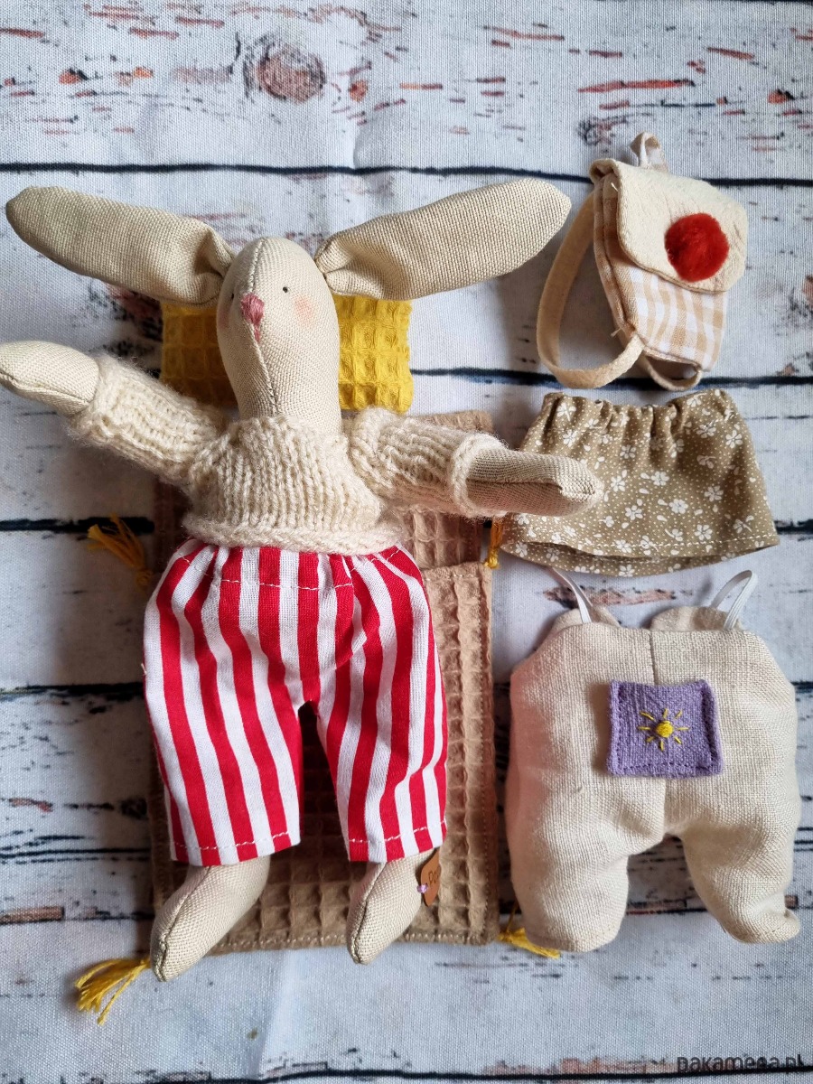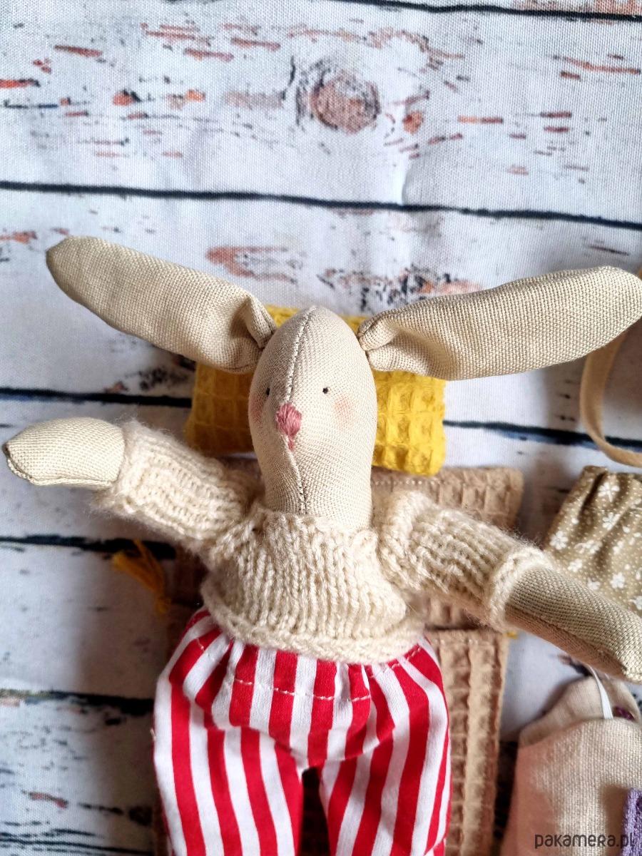 Mała przytulanka w sweterku z akcesoriami.