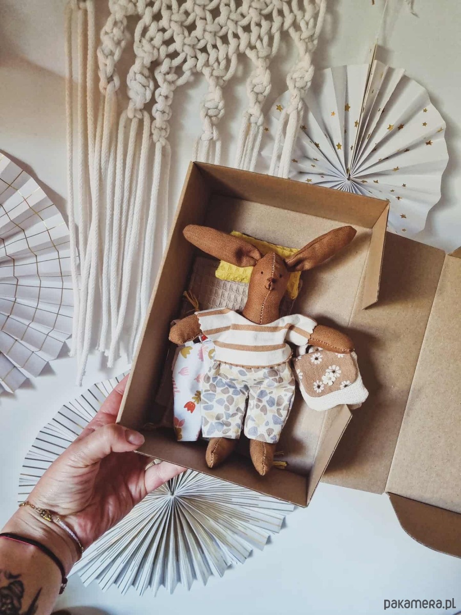Przytulanka jest zapakowana w pudełeczko i gotowy do wręczenia.