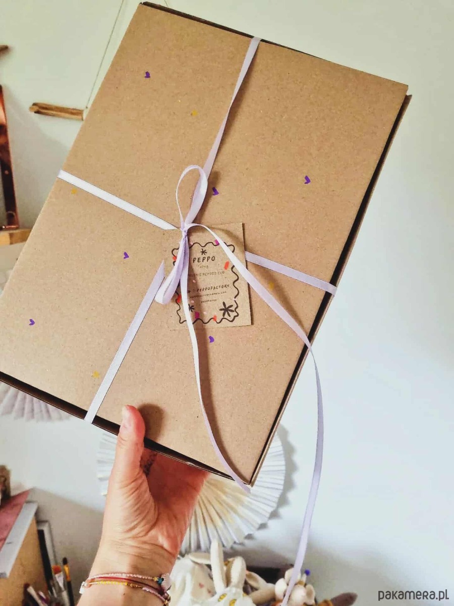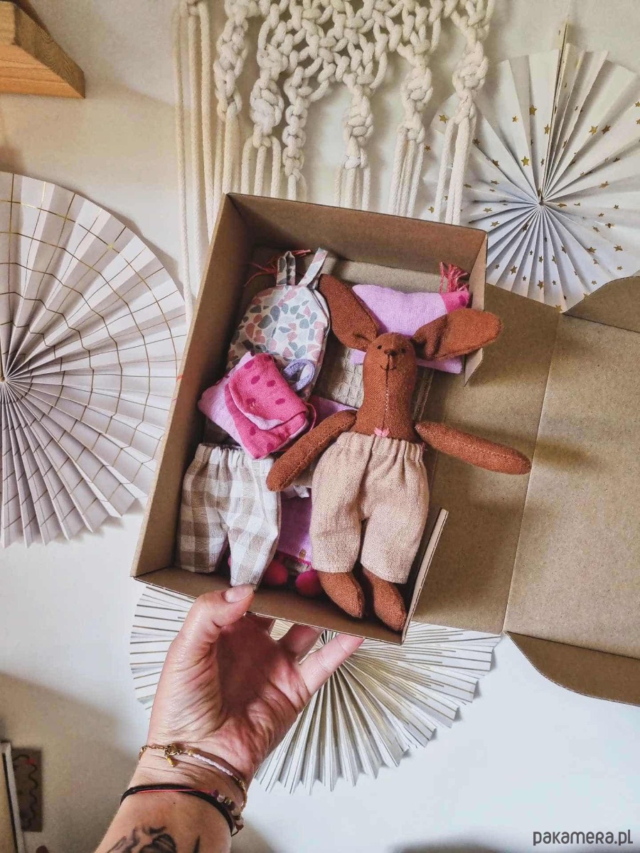Przytulanka jest zapakowana w pudełeczko i gotowy do wręczenia.