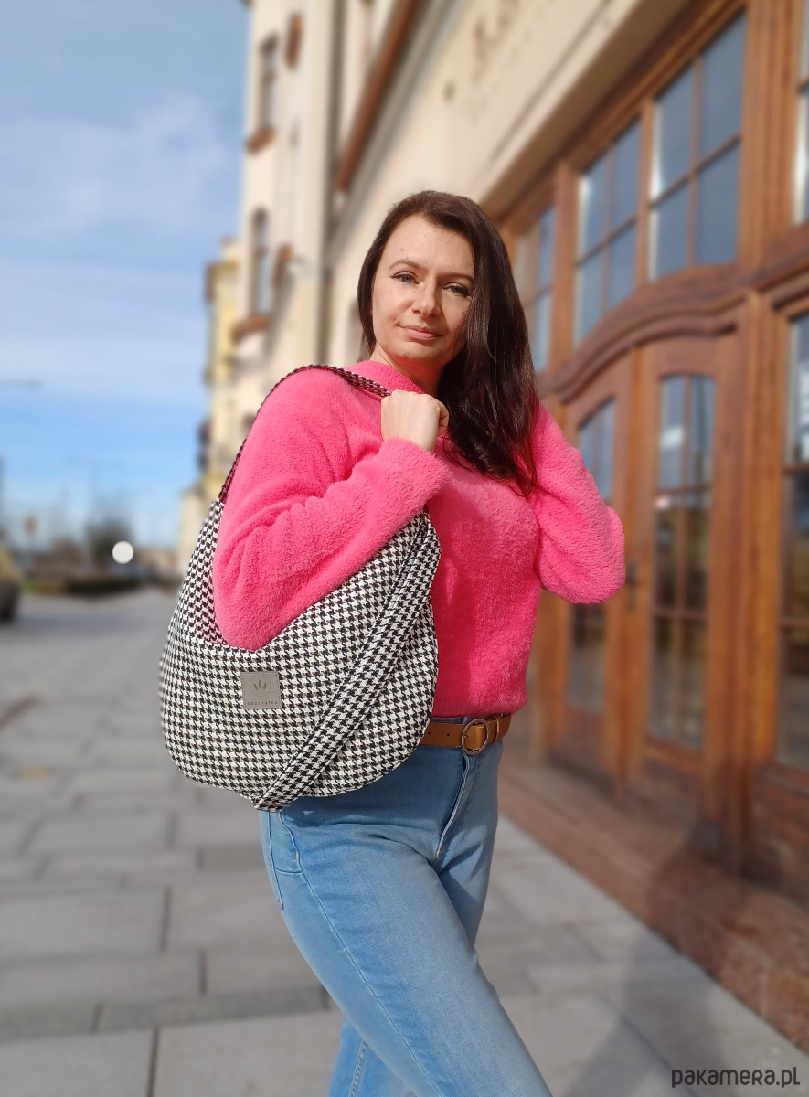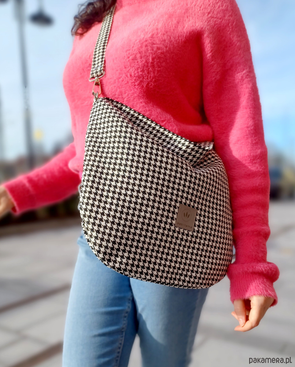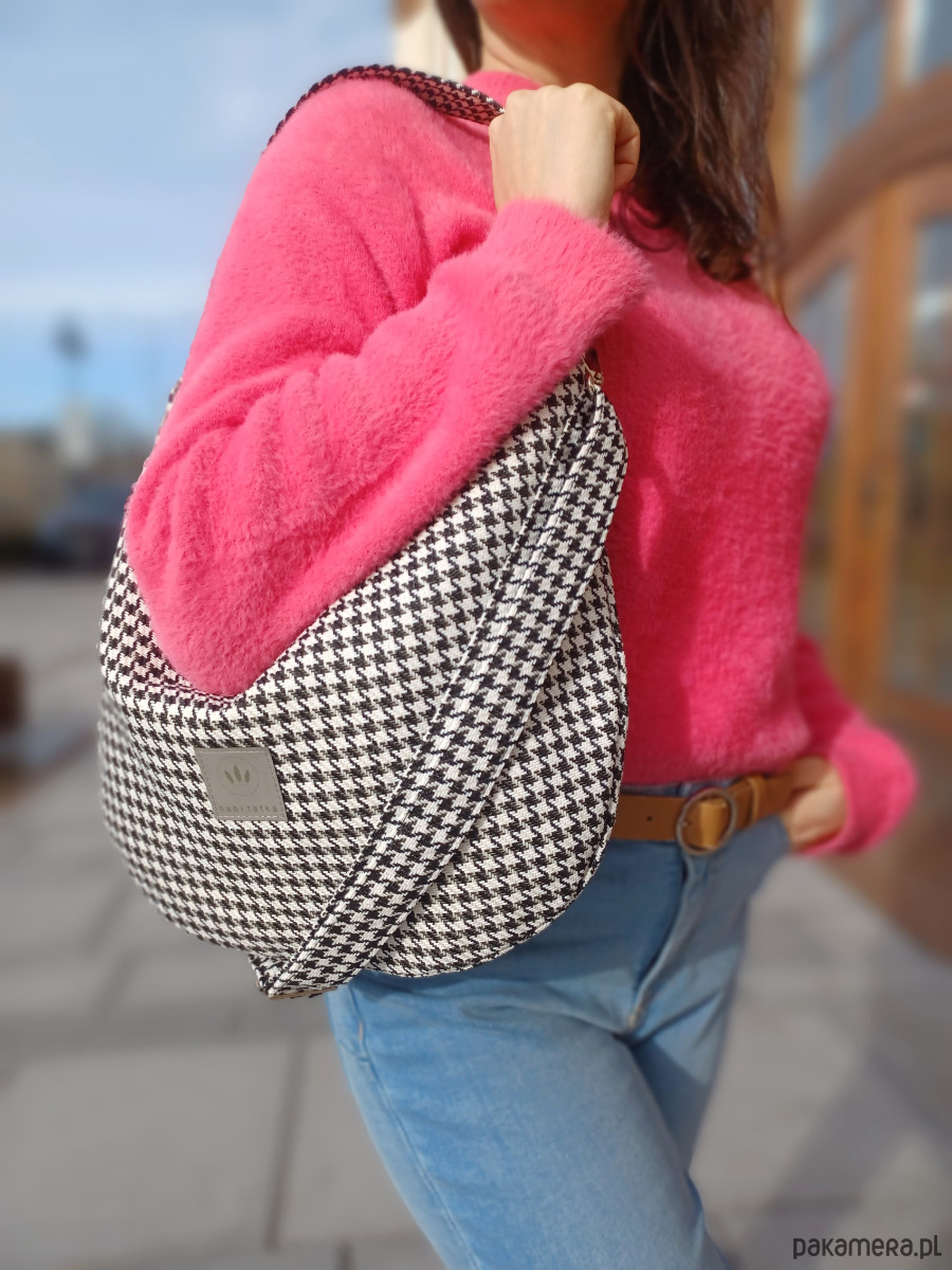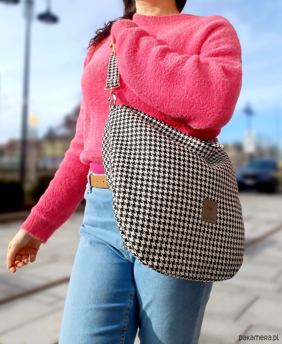 Nieduża torebka hobo z wzorem biało-czarnej pepitki.