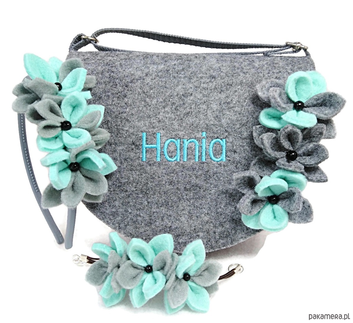 Mała torebeczka z imieniem z kwiatuszkami plus opaska, bransoletka