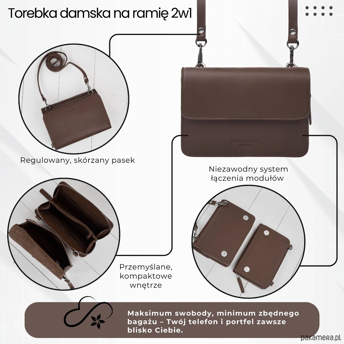 Modułowa konstrukcja 2w1Torebka + kopertówka połączone magnetycznymi klipsami - noś razem lub osobno.