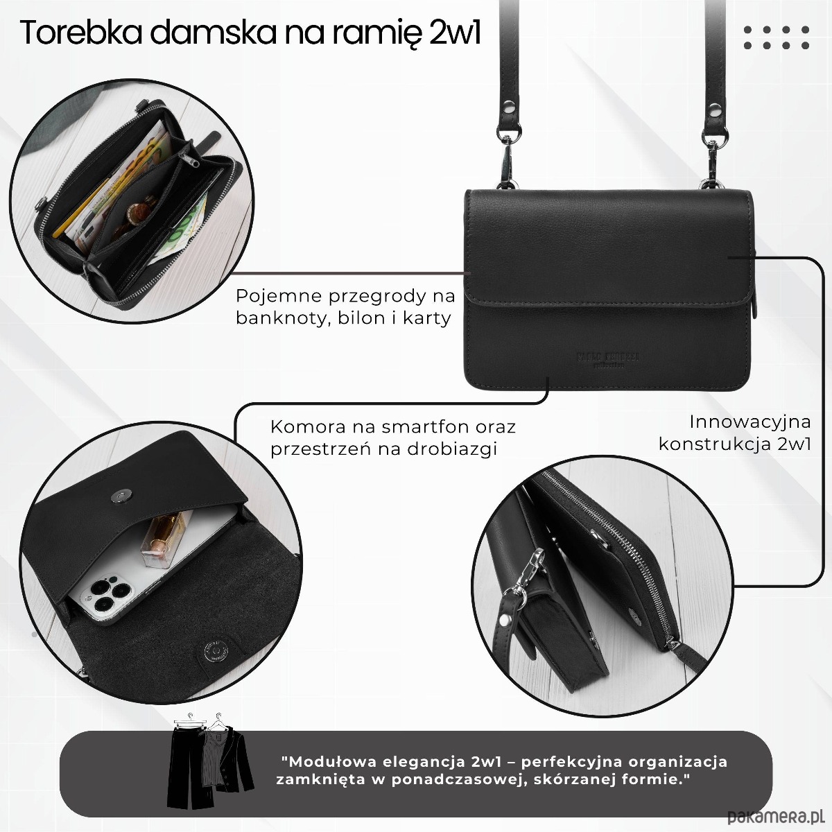 Modułowa konstrukcja 2w1Torebka + kopertówka połączone magnetycznymi klipsami - noś razem lub osobno.