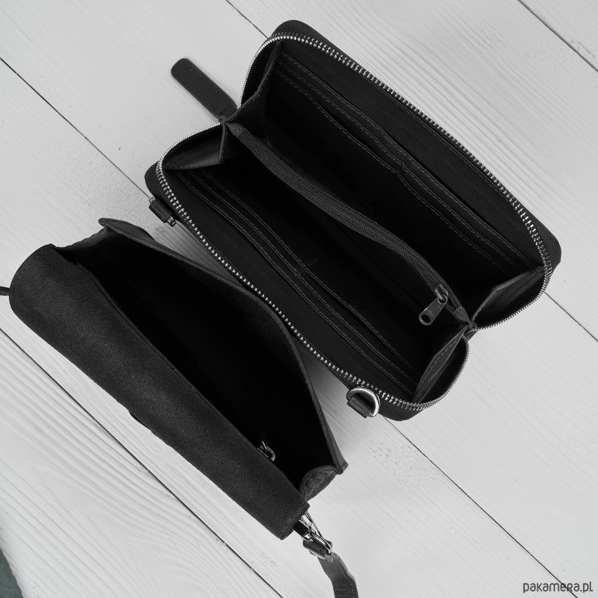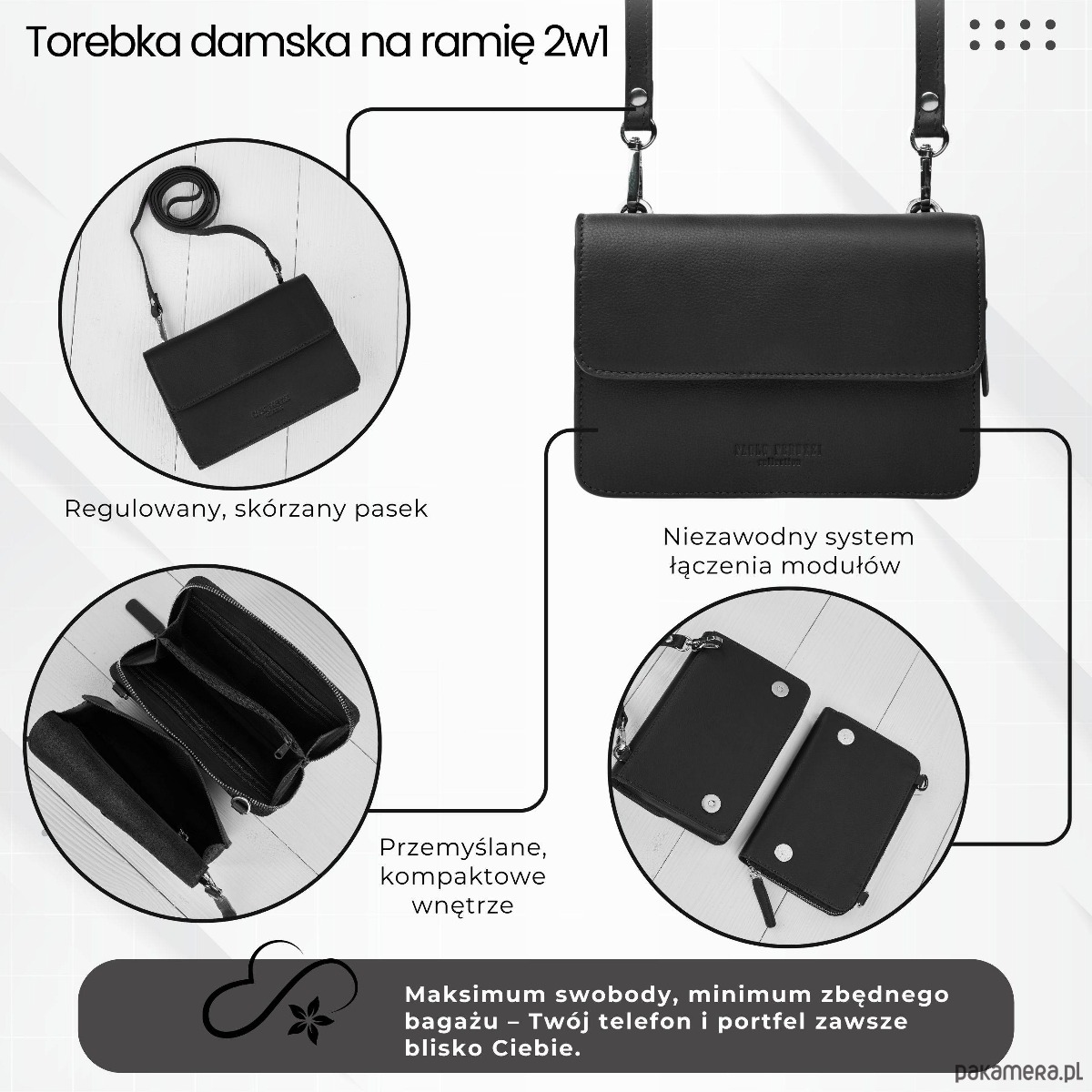 Główna część to elegancka, mała torebka damska zapinana na magnetyczny klips -idealna na co dzień. Drugi moduł to smukła kopertówka na zamek, pełniąca rolę praktycznego organizera. Dzięki magnetycznym klipsom możesz w kilka sekund połączyć oba elementy w jedną całość albo korzystać z nich niezależnie.
