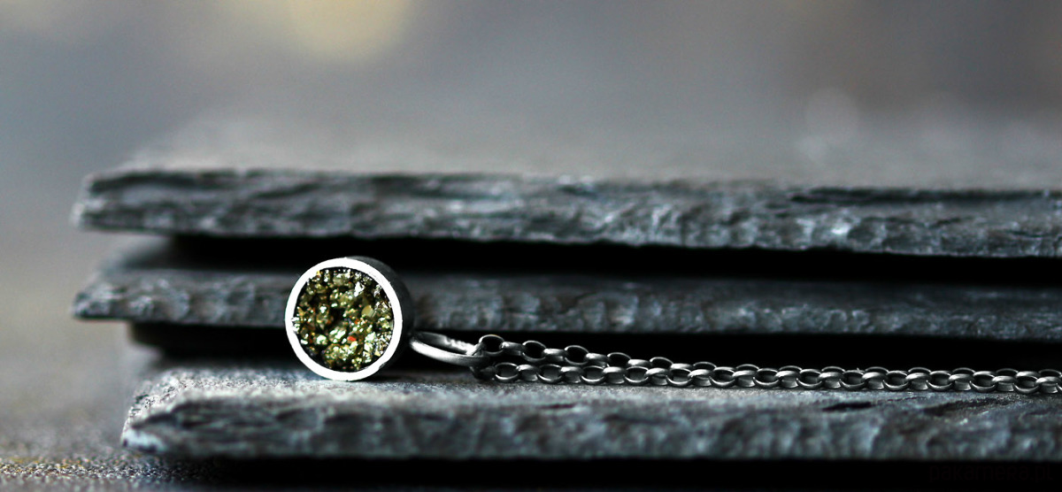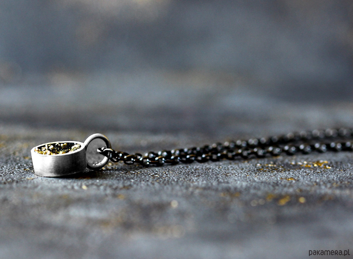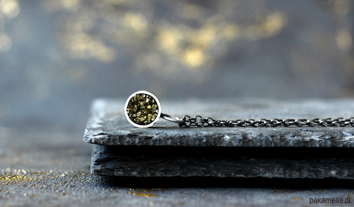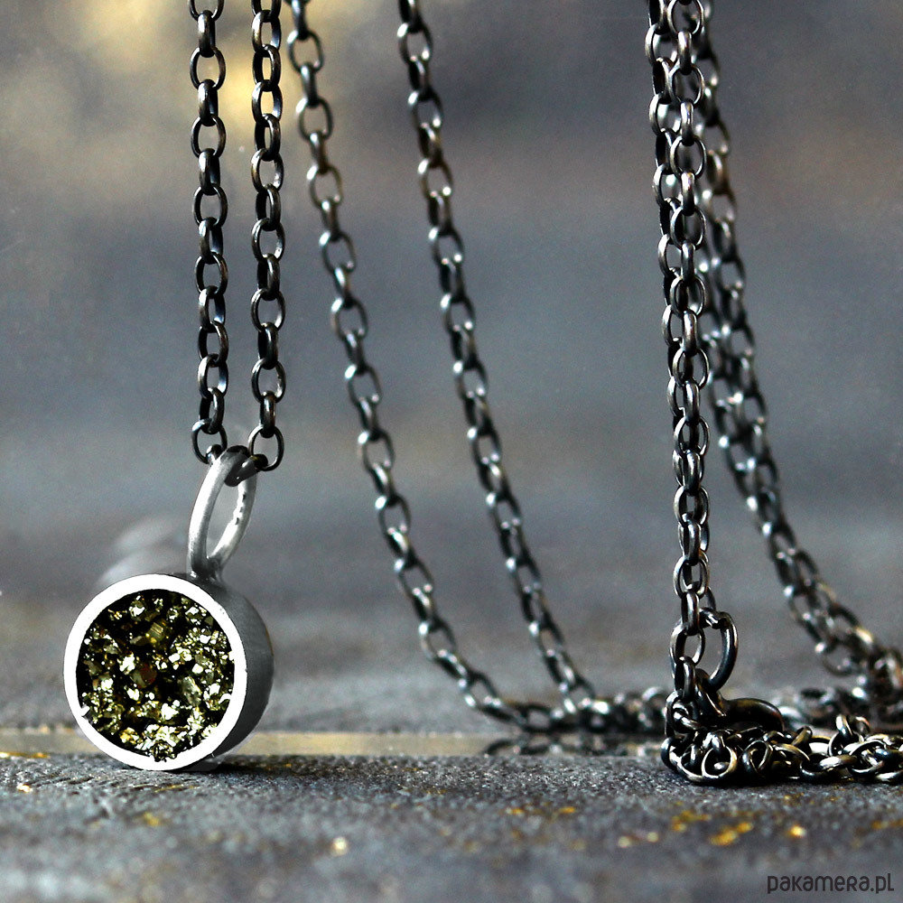 Minimalistyczny, nowoczesny wisiorek wykonany z oksydowanego srebra próby 925. Wewnątrz srebrnej formy znajduje się minerał piryt, mieniący się fantastyczną złotymi refleksami. Wisiorek jest bardzo delikatny i elegancki. Będzie też uniwersalną, minimalistyczną ozdobą w ciągu dnia. Świetnie sprawdzi się również do wieczorowych stylizacji.