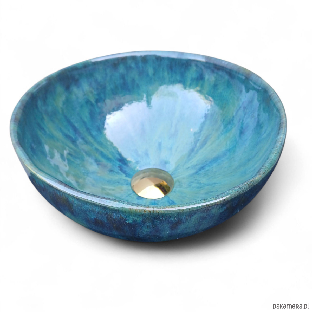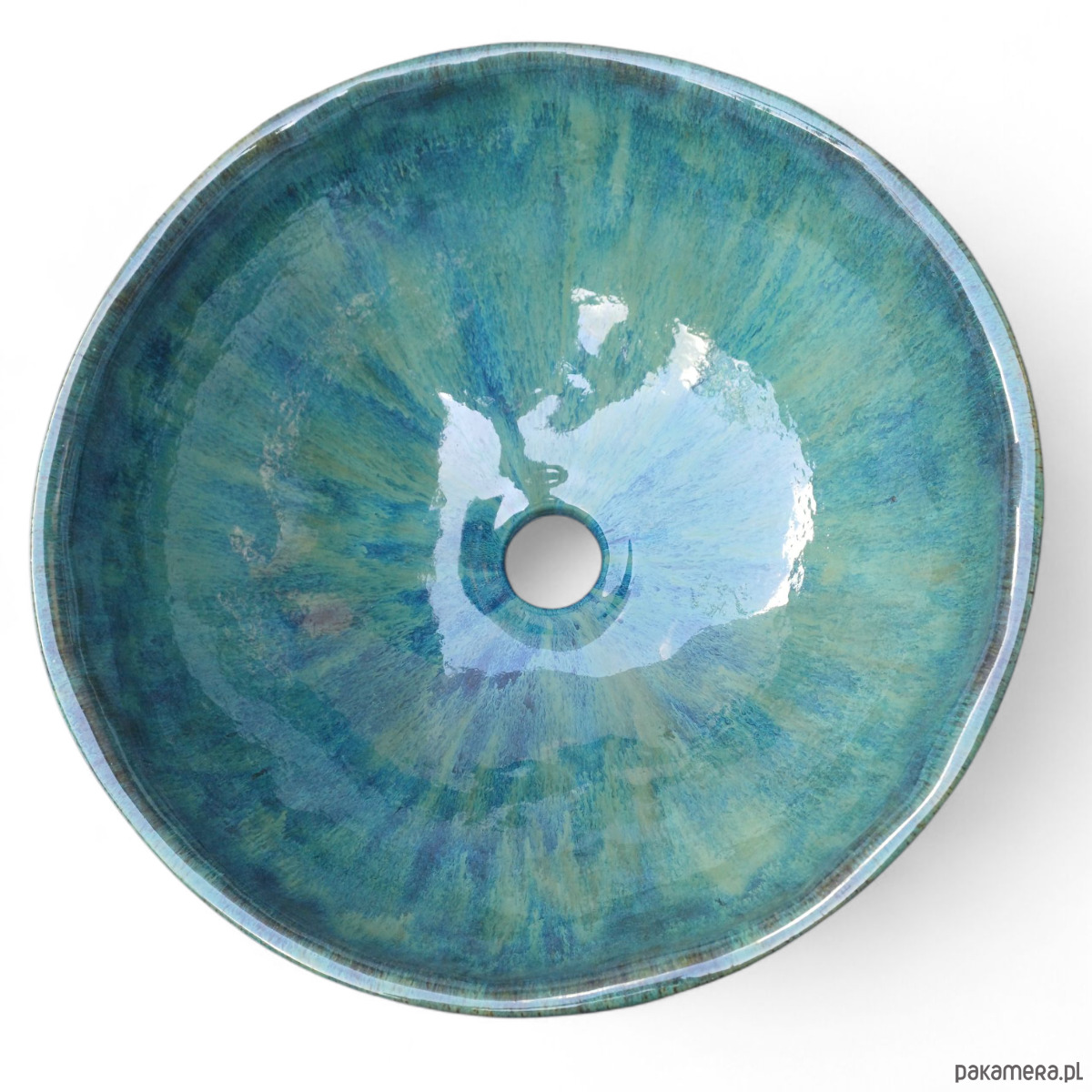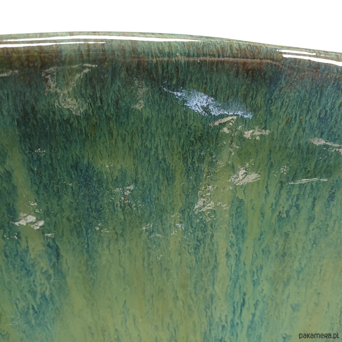 Mała, ręcznie wykonana ceramiczna umywalka w różnych odcieniach ZIELENI, od seledynowej po zgniłozieloną. W niektórych miejscach szkliwo wydaje się lekko niebieskie.