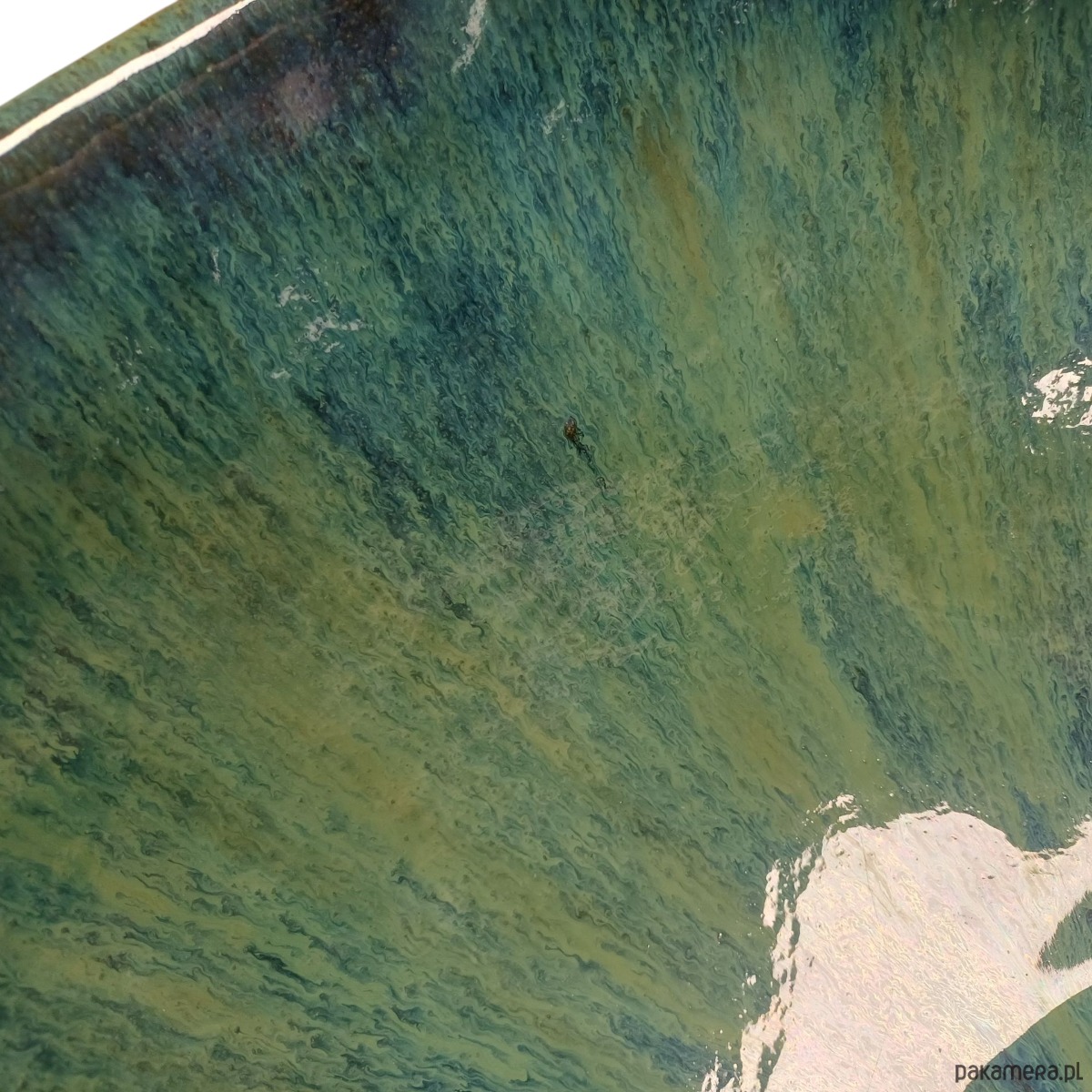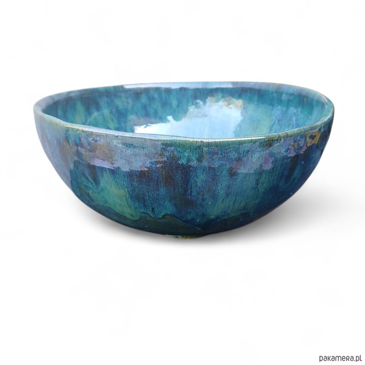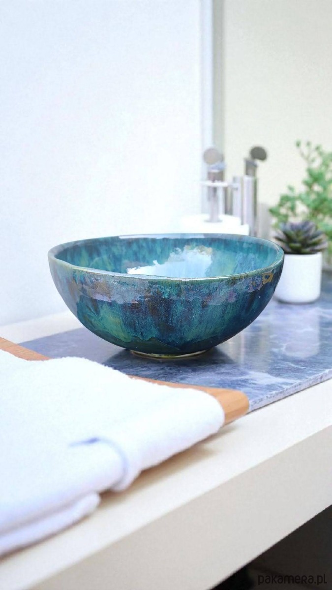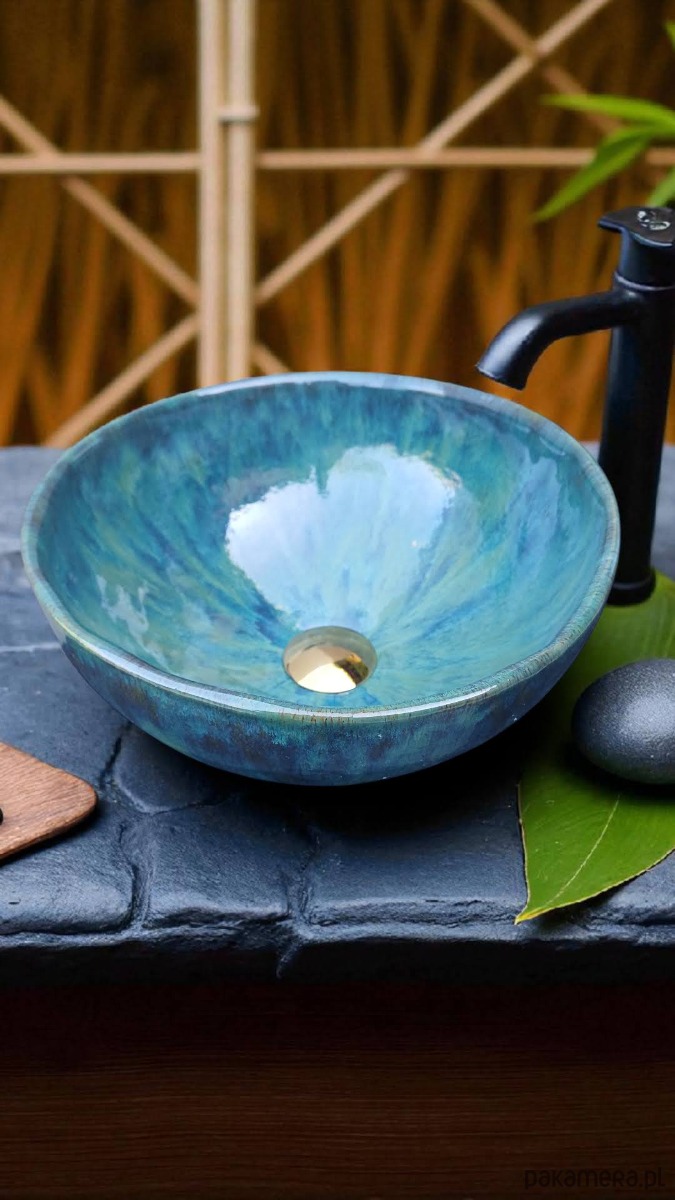Mała, ręcznie wykonana ceramiczna umywalka w różnych odcieniach ZIELENI, od seledynowej po zgniłozieloną. W niektórych miejscach szkliwo wydaje się lekko niebieskie.
