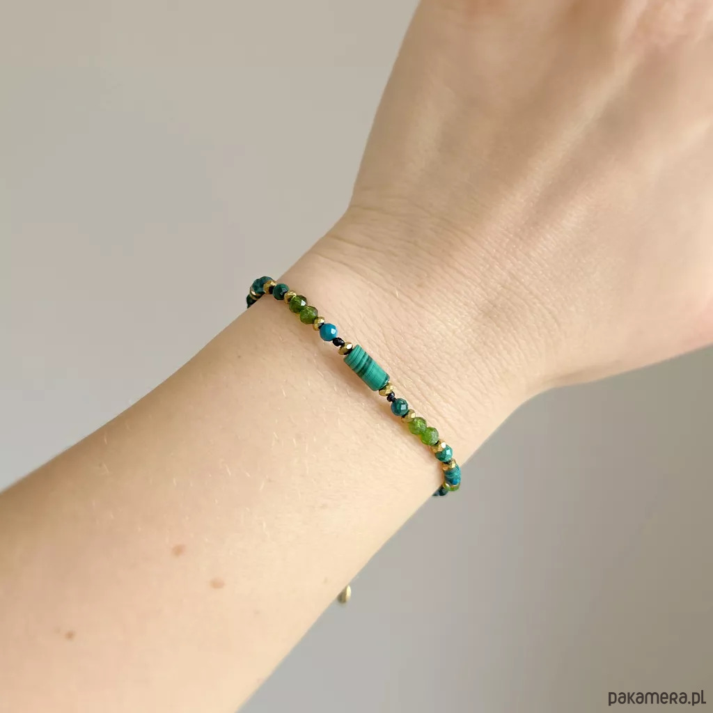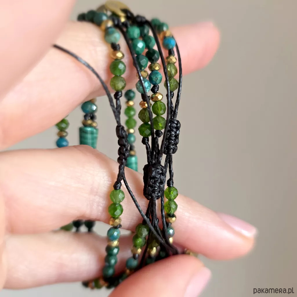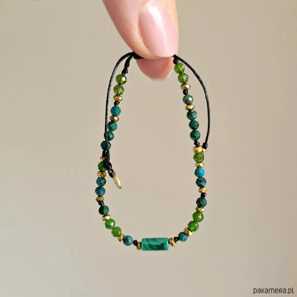 Bransoletka wykonana z kamieni naturalnych - malachitu, diopsydu chromowego, chryzokoli i hematytu oraz nylonowego sznureczka. Bransoletka będzie odpowiednia na nadgarstek o obwodzie 15-16,5 cm.