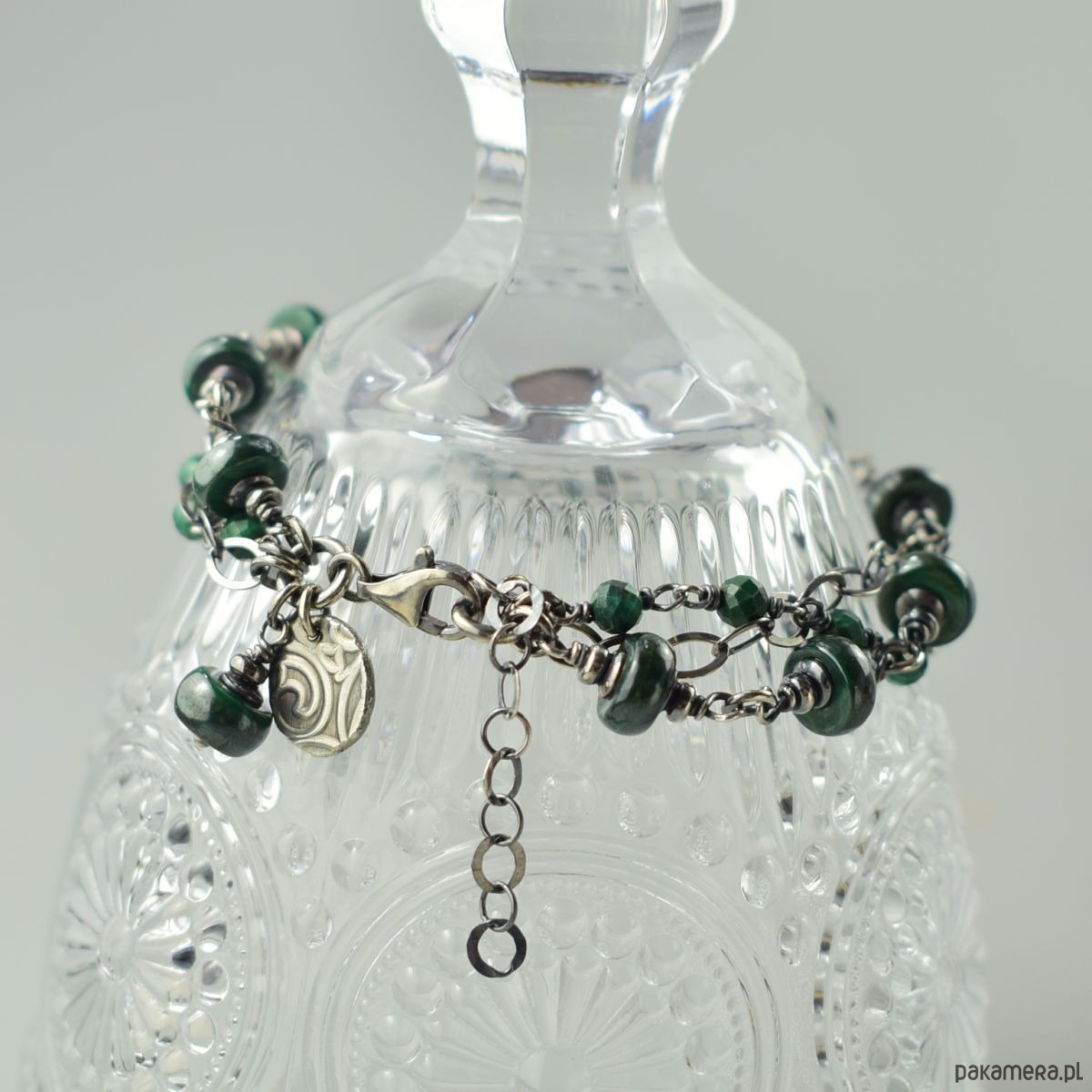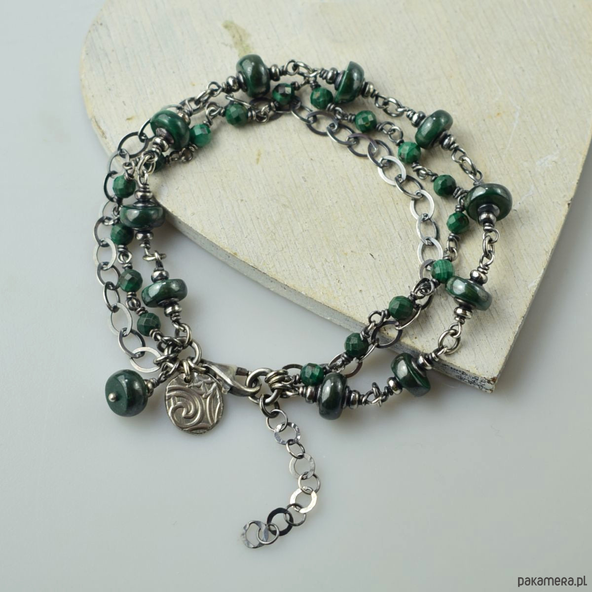 Bransoletka wykonana w całości ze srebra (próba 925) z malachitem. Całość została zoksydowana (przyciemniona) i wypolerowana. Długość regulowana 20 - 23,5 cm. Biżuteria zostanie ozdobnie zapakowana.