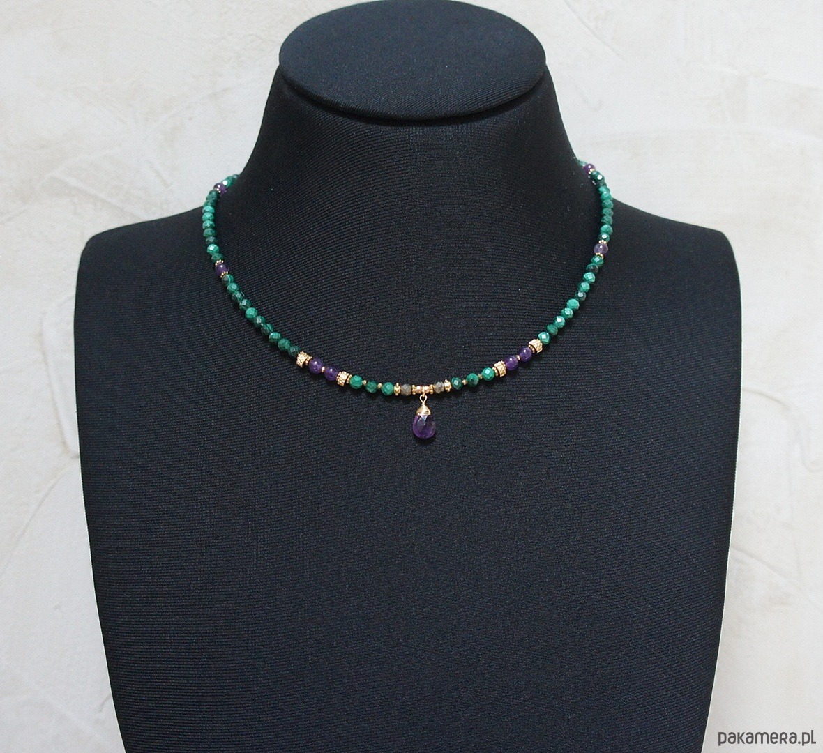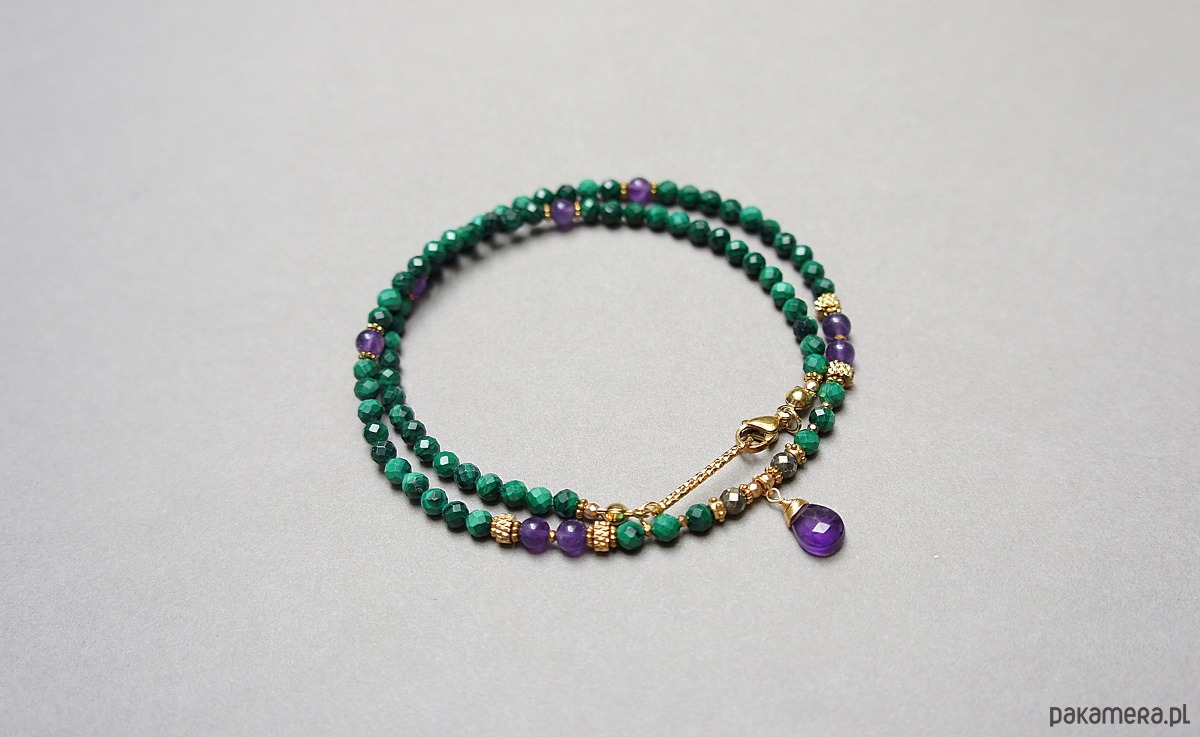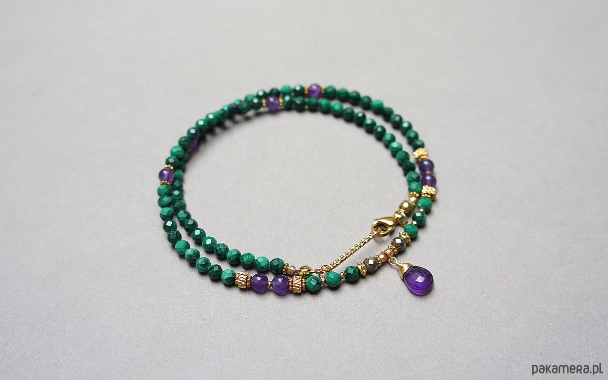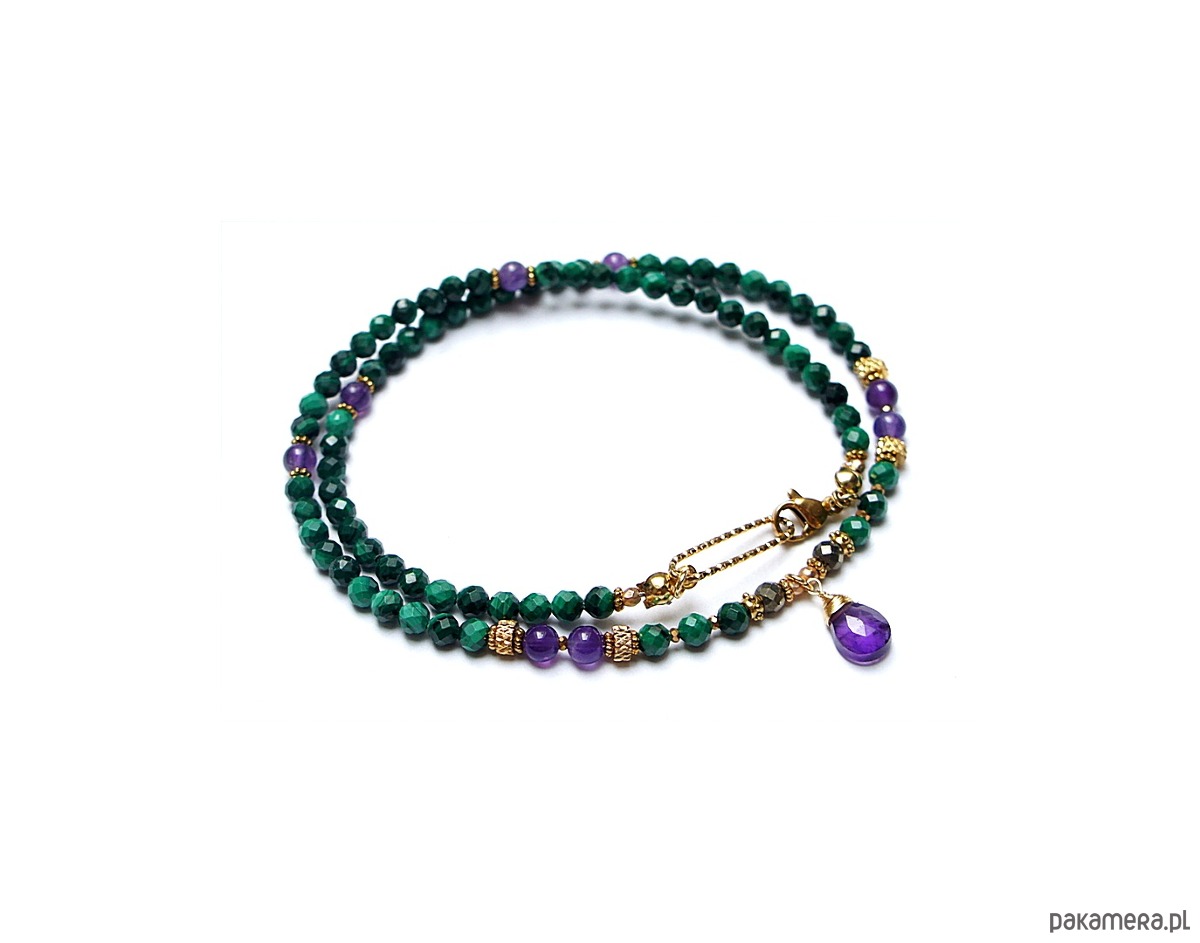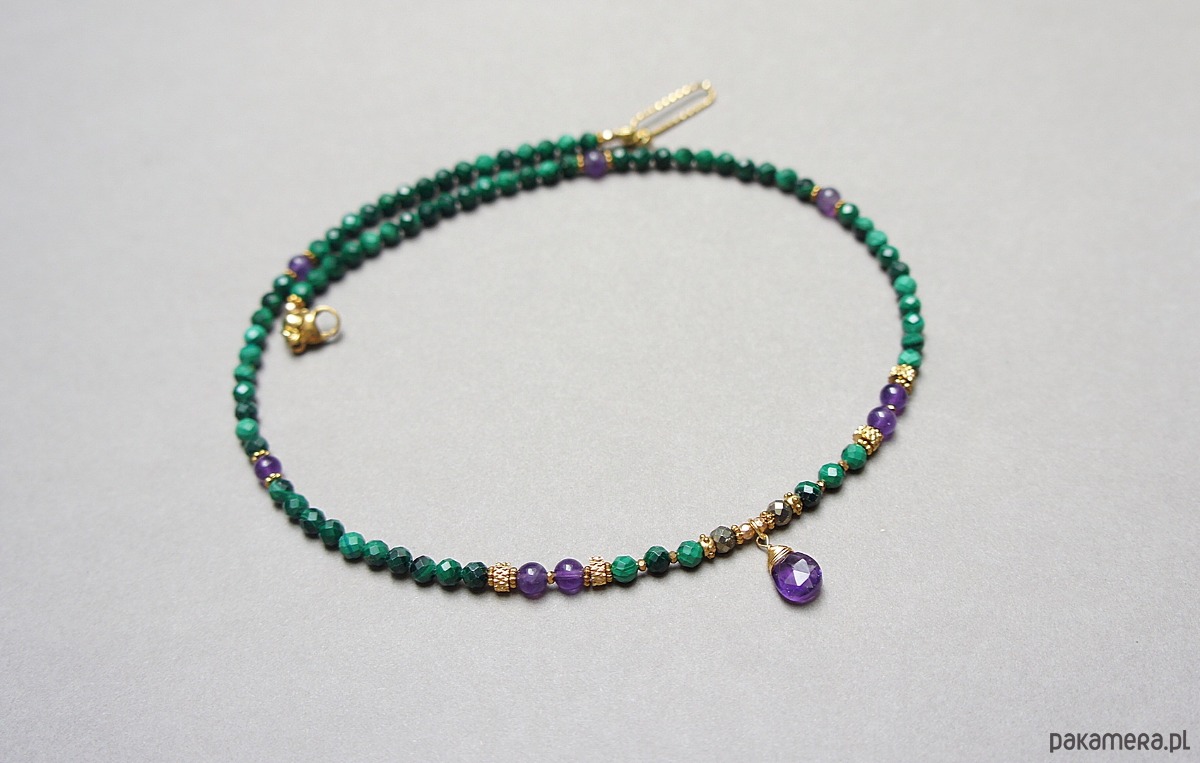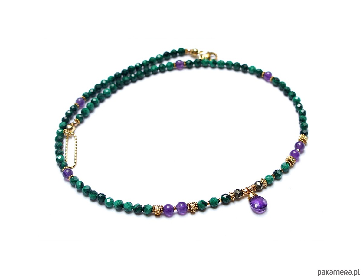 Krótki, delikatny naszyjnik wykonany w całości z pozłacanej stali szlachetnej oraz naturalnych, szlachetnych kamieni - malachity fasetowane [4mm], piryt fasetowany [4mm],hematytu fasetowanego, platerowanego [2mm], przekładek z hematytu [1mm], gładkich ametystów [5mm] oraz zawieszki z brioletki naturalnego, fasetowanego ametystu. Naszyjnik o długości ok. 43,5cm. Biżuteria ozdobnie zapakowana.