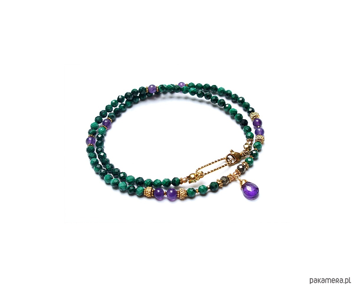 Krótki, delikatny naszyjnik wykonany w całości z pozłacanej stali szlachetnej oraz naturalnych, szlachetnych kamieni - malachity fasetowane [4mm], piryt fasetowany [4mm],hematytu fasetowanego, platerowanego [2mm], przekładek z hematytu [1mm], gładkich ametystów [5mm] oraz zawieszki z brioletki naturalnego, fasetowanego ametystu. Naszyjnik o długości ok. 43,5cm. Biżuteria ozdobnie zapakowana.