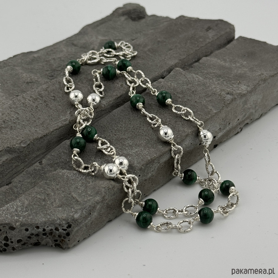 Modny, kobiecy naszyjnik na co dzień i nie tylko. Wykonany w całości ze srebra próby 925 oraz kulek malachitu wielkości 6 mm. Obwód naszyjnika od 50,5 do 55 cm. Ogniwa łancuszka są wielkości 5,5x3,5 mm. W mojej galerii bransoletka do kompletu. Ozdobnie zapakowany.