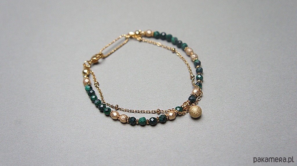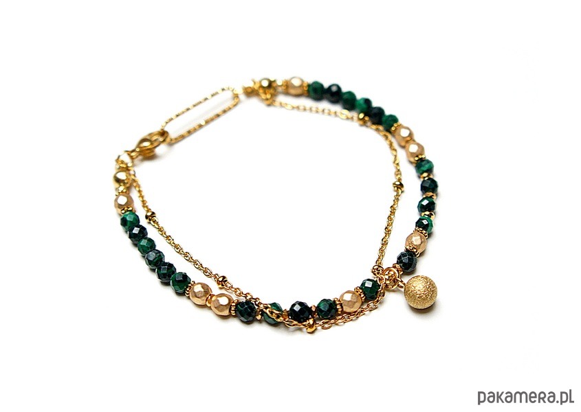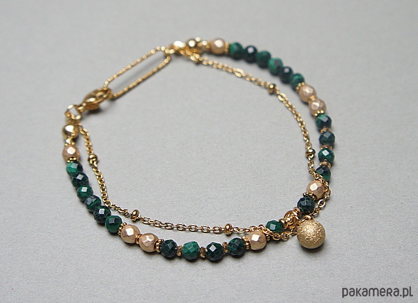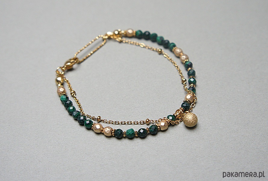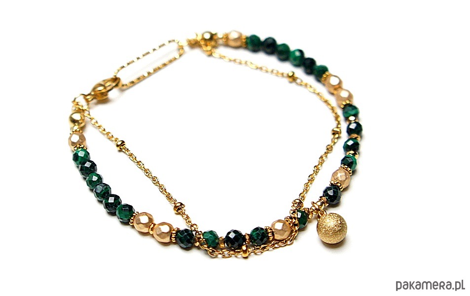 Delikatna bransoletka wykonana w całości z pozłacanej stali szlachetnej oraz naturalnych, szlachetnych kamieni - malachitów fasetowanych [3mm], hematytów [1mm i 4mm]. Całkowita długość bransoletki: 18,5cm.