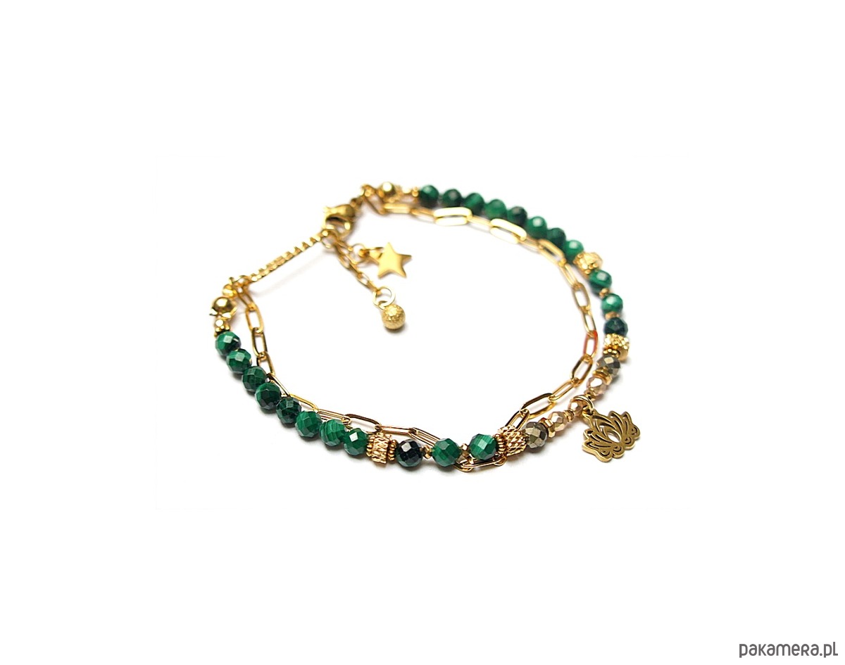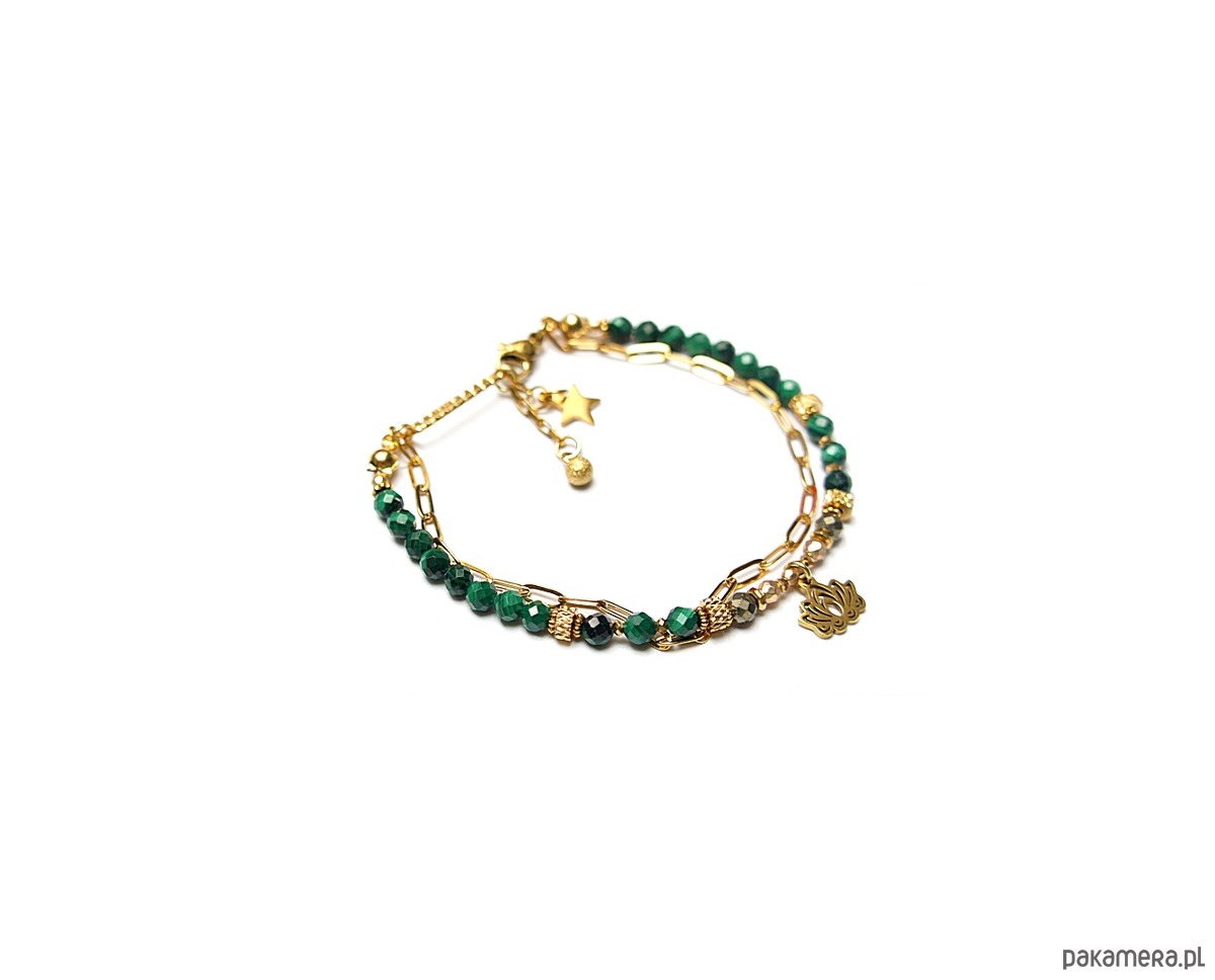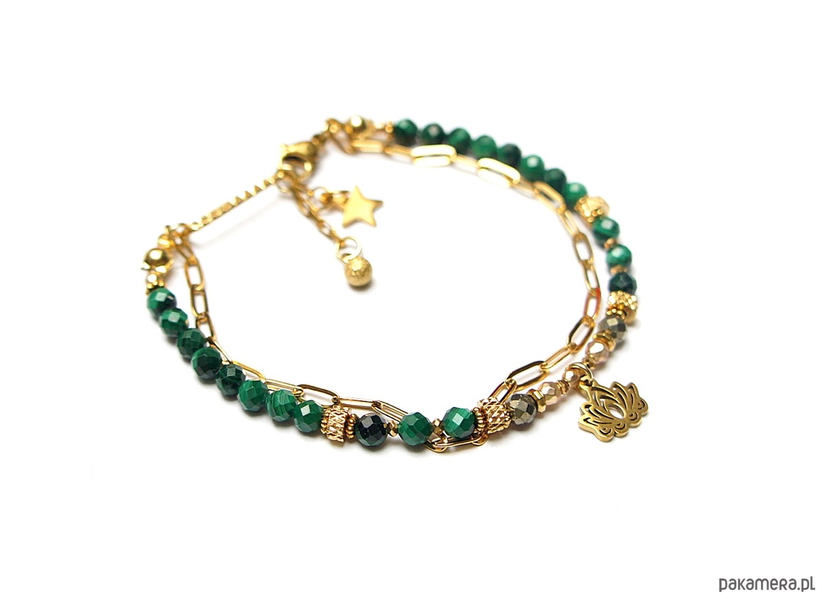 Delikatna bransoletka wykonana w całości z pozłacanej stali szlachetnej oraz naturalnych, szlachetnych kamieni - malachitów fasetowanych [4mm], pirytów fasetowanych [4mm], hematytów [3mm i 2mm], przekładek z hematytów [1mm]. Całkowita długość bransoletki: 18,3cm.