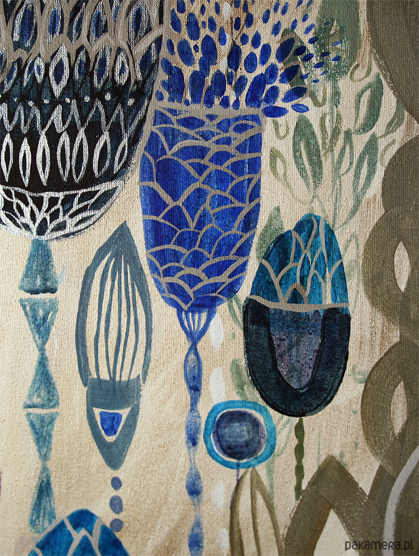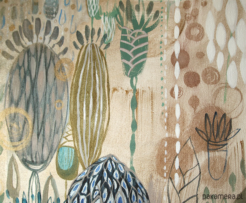 Podłoże: Zagruntowane płótno naciągnięte na drewniane krosna. Gotowe do powieszenia.
