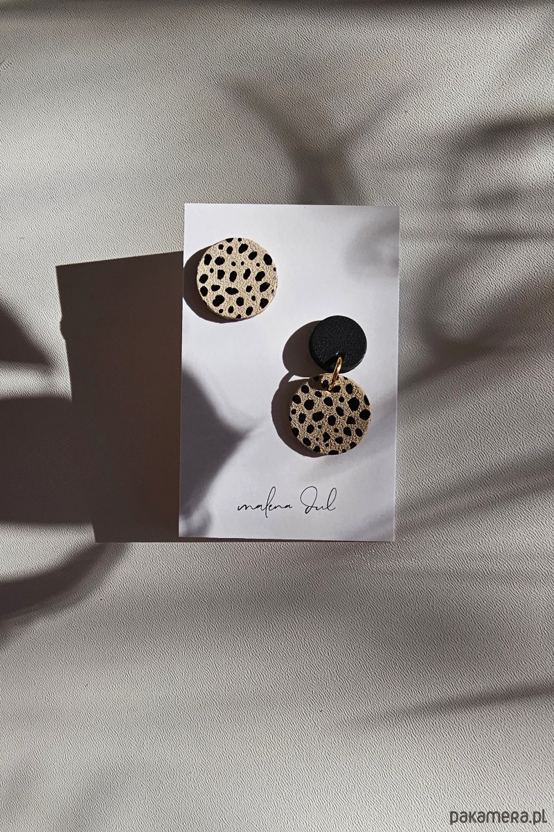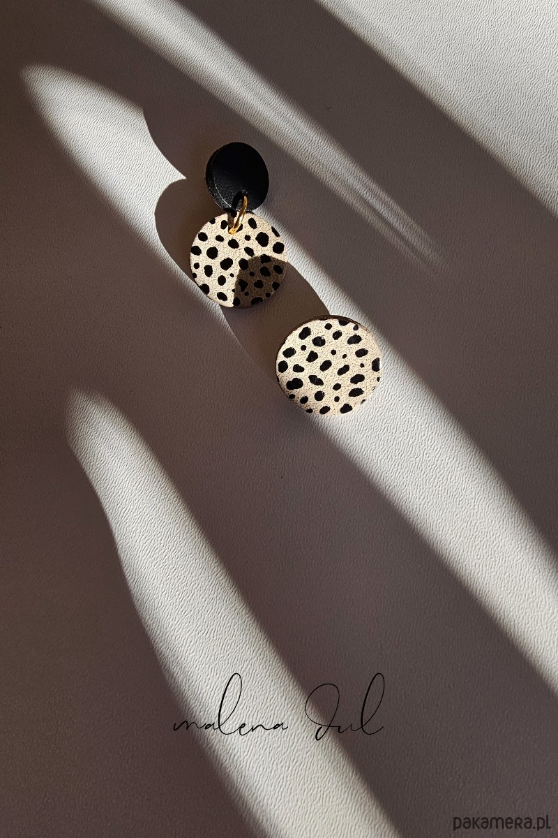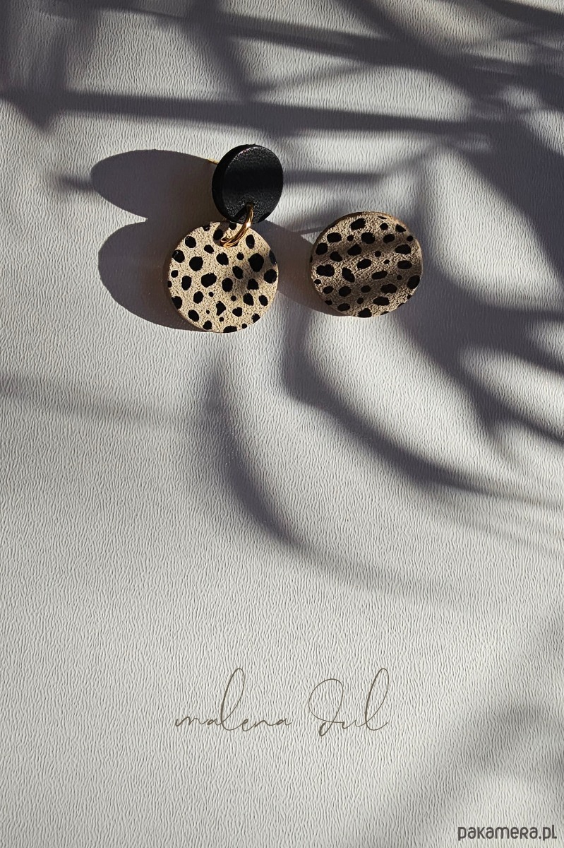 Małe, asymetryczne kolczyki koła beżowa skóra naturalna czarne cętki