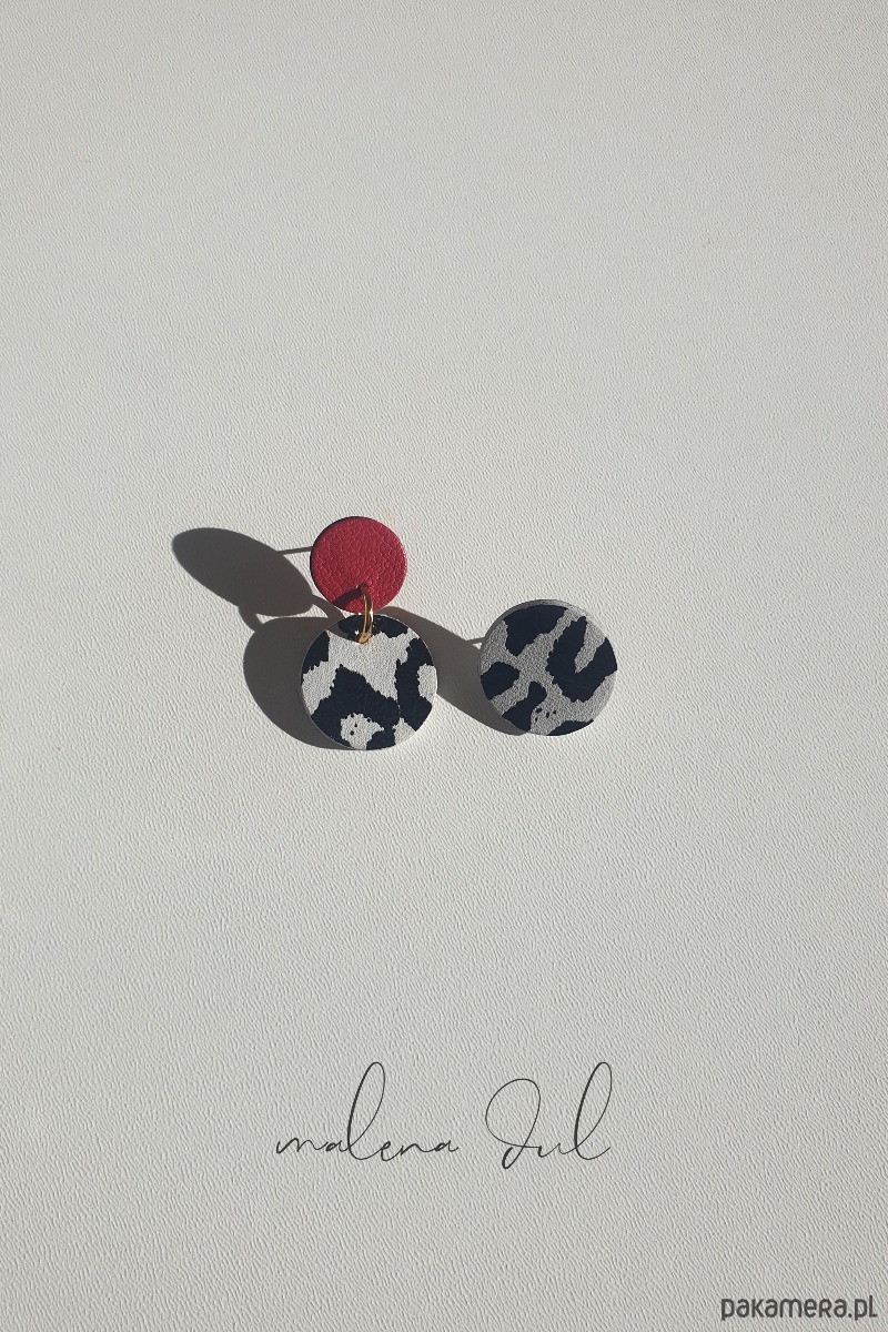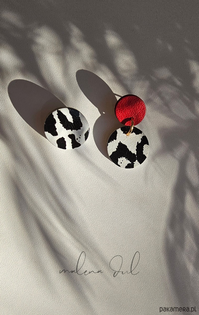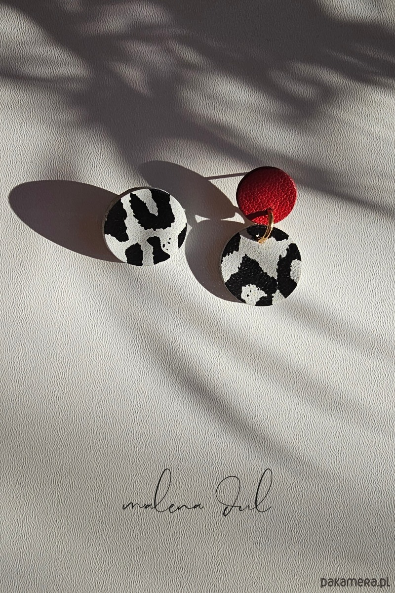Delikatne i bardzo kobiece kolczyki - asymetryczne. Skóra naturalna, biało czarna panterka i czerwona. Zjawiskowe, inne niż wszystkie. Lekkie i wygodne. Nie obciążają ucha. Polaczenie biało czarnego zwierzęcego wzoru z czerwienią tworzy bardzo eleganckie zestawienie. Idealne na wieczór i na co dzien.