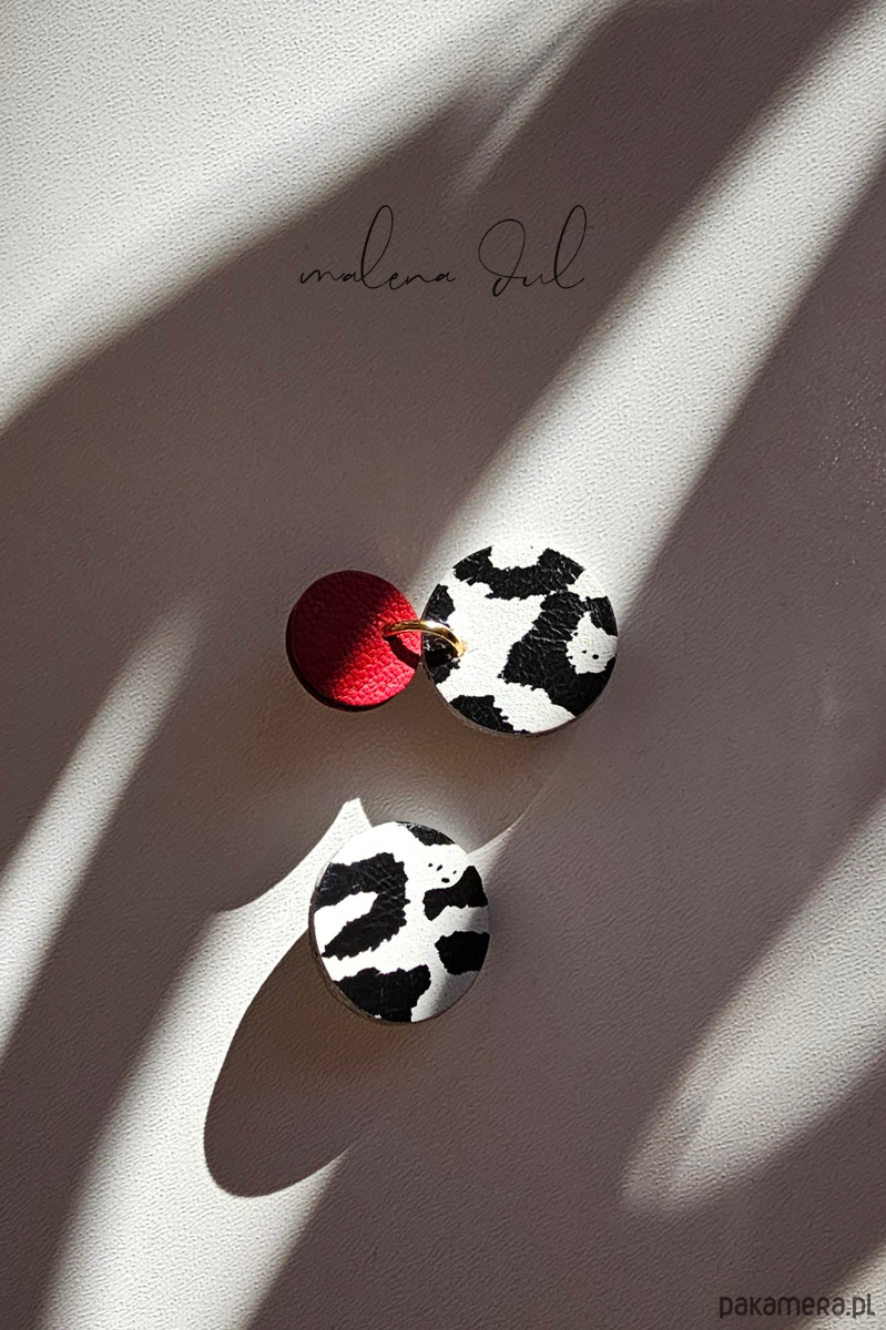 Małe, asymetryczne kolczyki kola czarno biała i czerwona skora naturalna