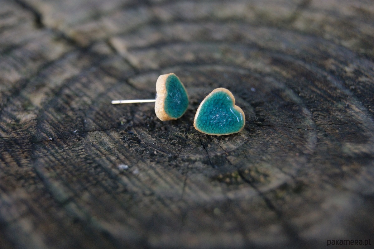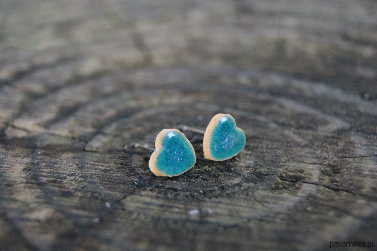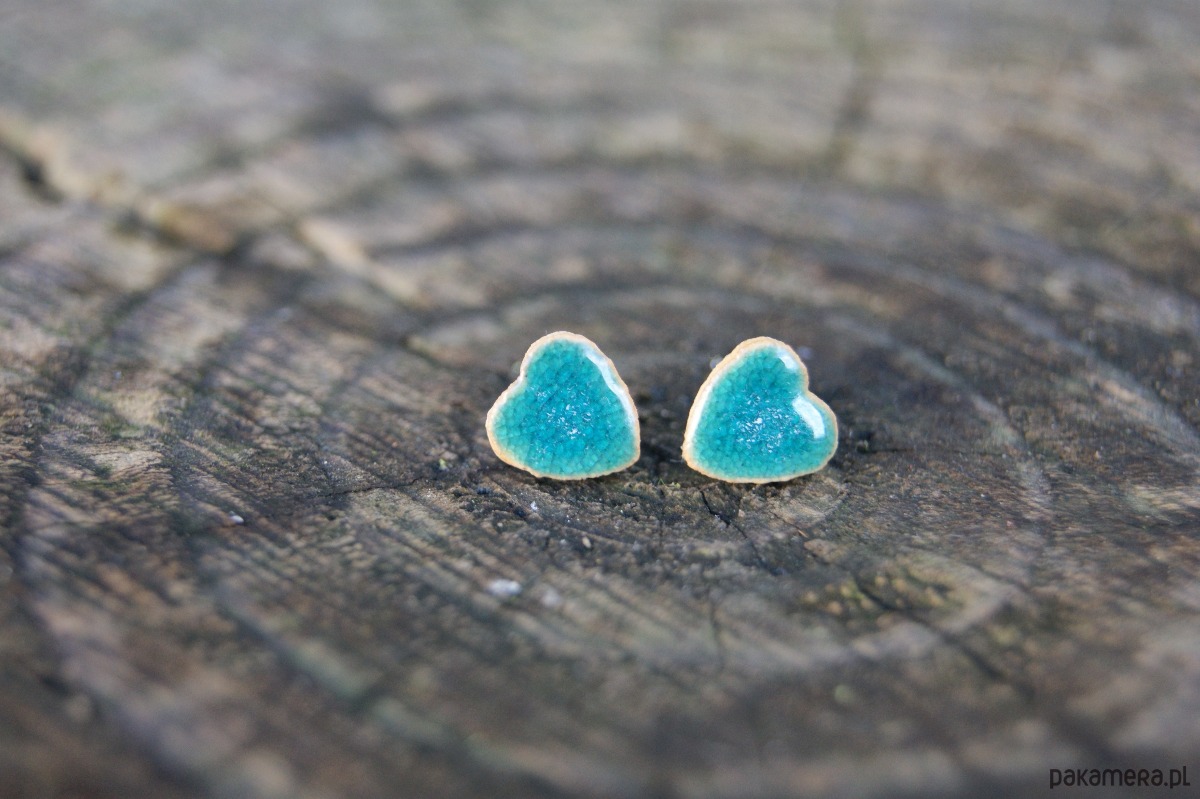 Cudowne ceramiczne kolczyki w kształcie serduszek. Wykonane z jasnej gliny pokryte turkusowym błyszczącym szkliwem.