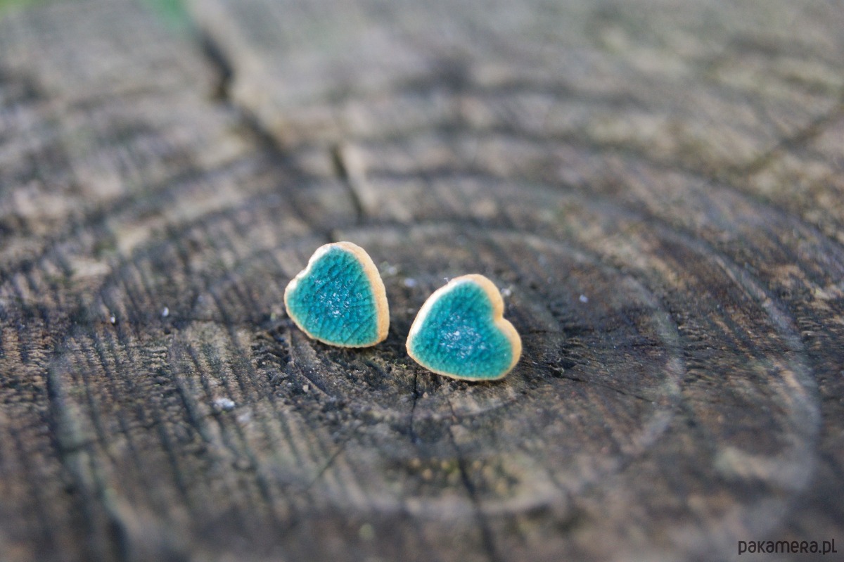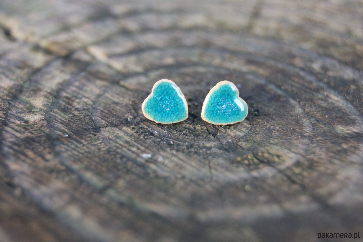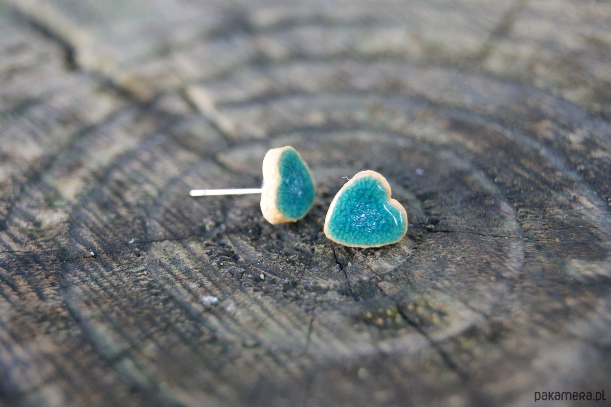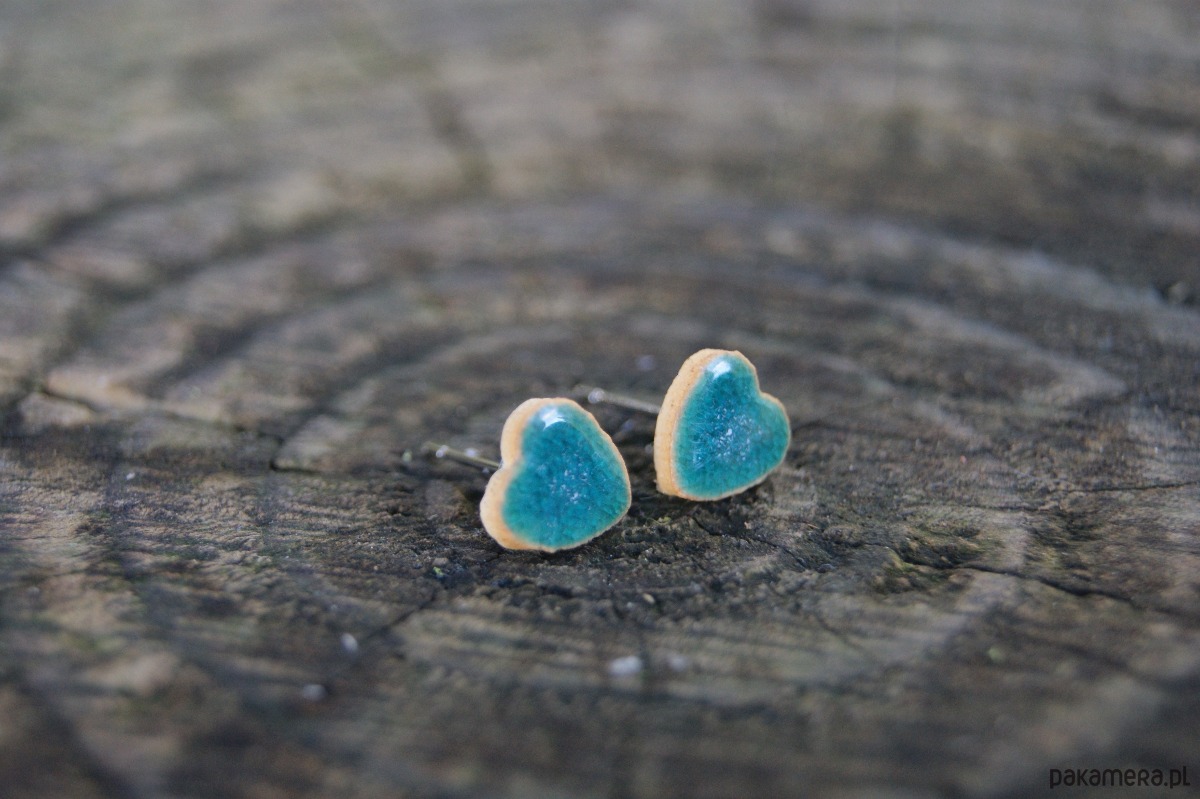 Cudowne ceramiczne kolczyki w kształcie serduszek. Wykonane z jasnej gliny pokryte turkusowym błyszczącym szkliwem.