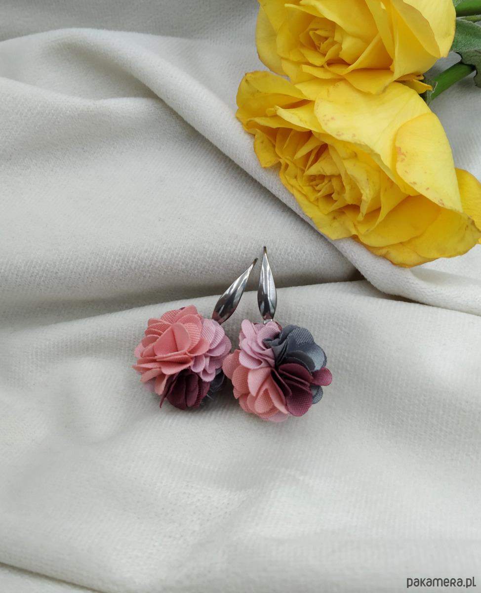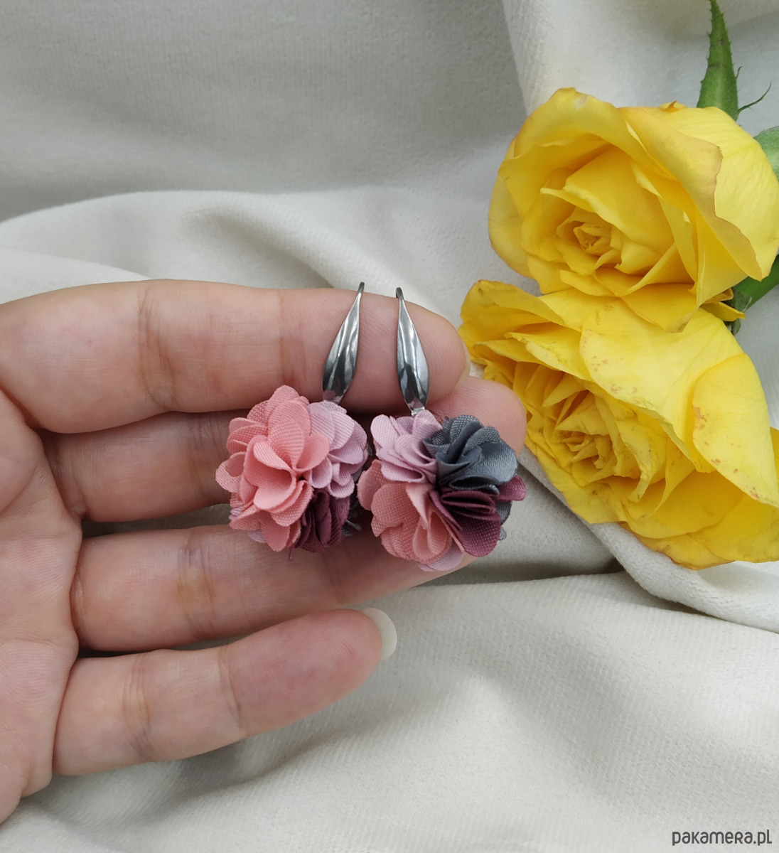 Kolczyki kwiaty w świetnym zestawieniu kolorów - grafit i odcienie różu i mauve.